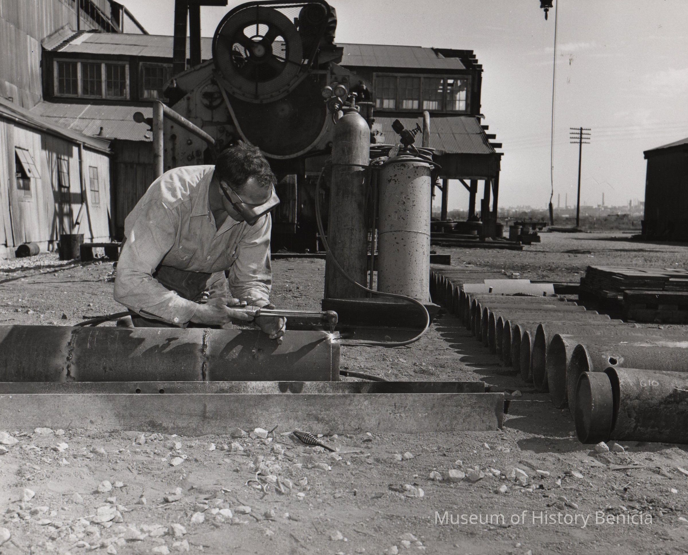 B/W photograph: per reverse side: Portable cylinders of MAPP gas permit in yard cutting of steel cylinders. In practice, one 60-pound cylinder of MAPP gas (shown in background) replaces 4 to 5 cylinders of acetylene, according to Yuba manufacturing division.Collection