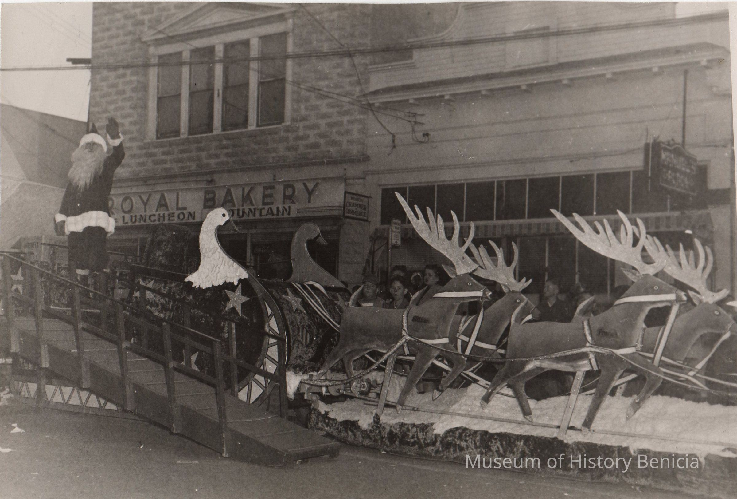 B/W Photograph: Santa Claus parade float and ramp on First Street in front of the Royal Bakery.