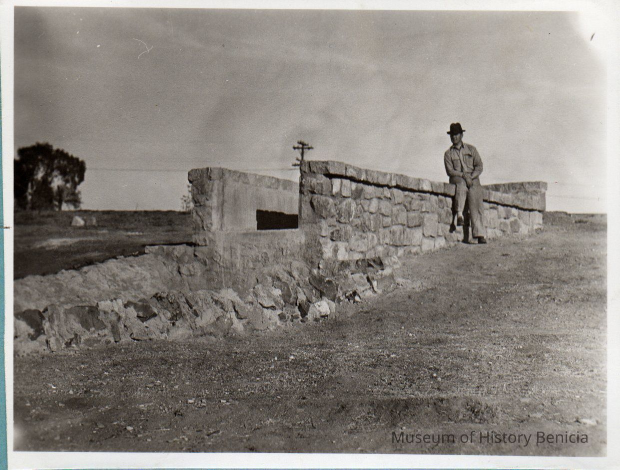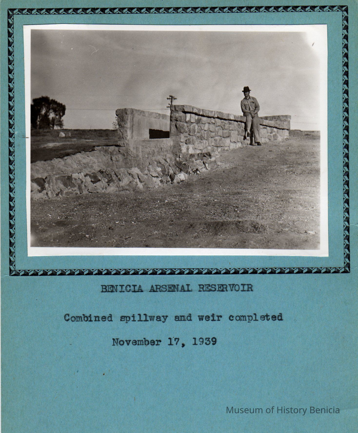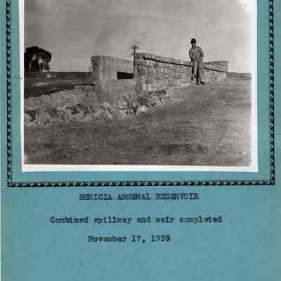 B/W photograph of a man sitting on a rock wall/structure. Below the photograph is a caption that reads "Benicia Arsenal Resevoir Combined Spillway and Weir Completed November 17, 1939"Collection