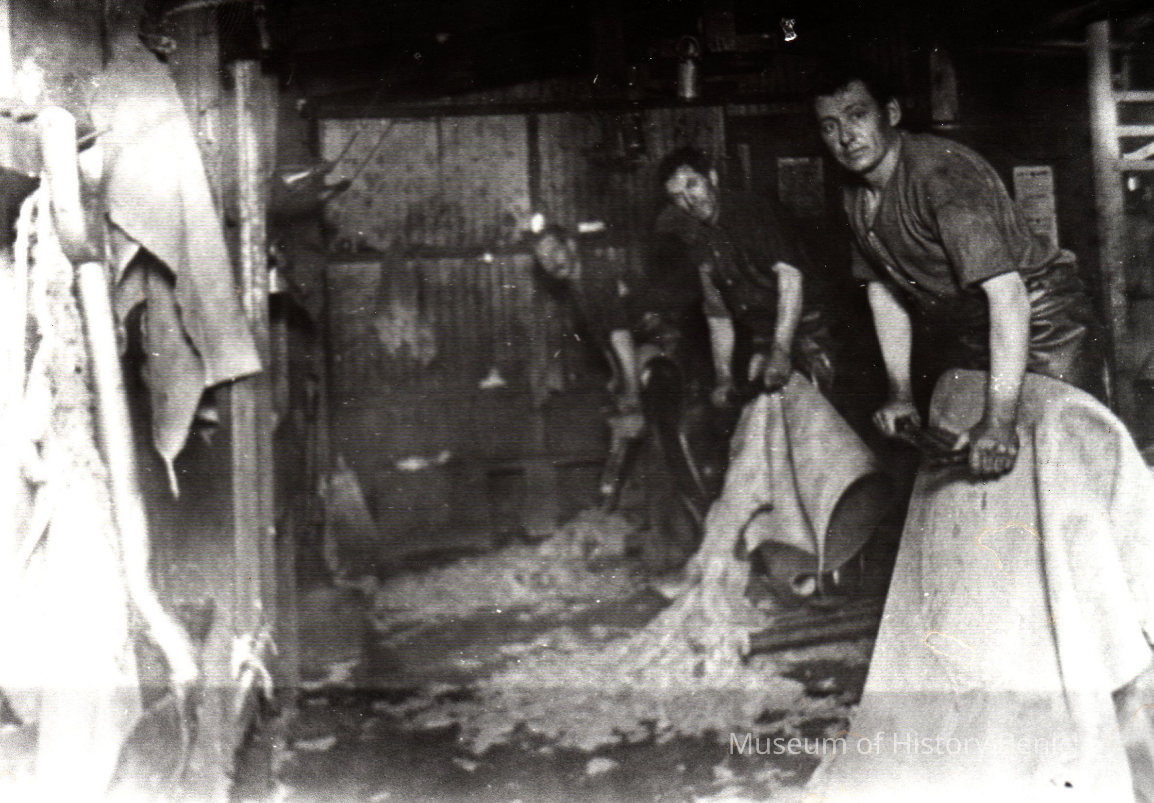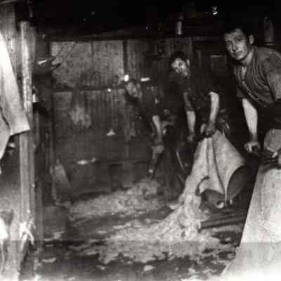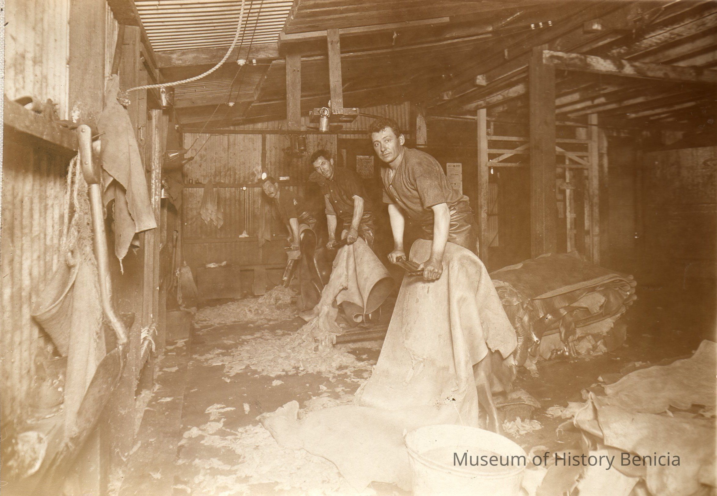 Sepia-tone photograph from an album: Kullman Salz Tannery workers scraping hair off hides.