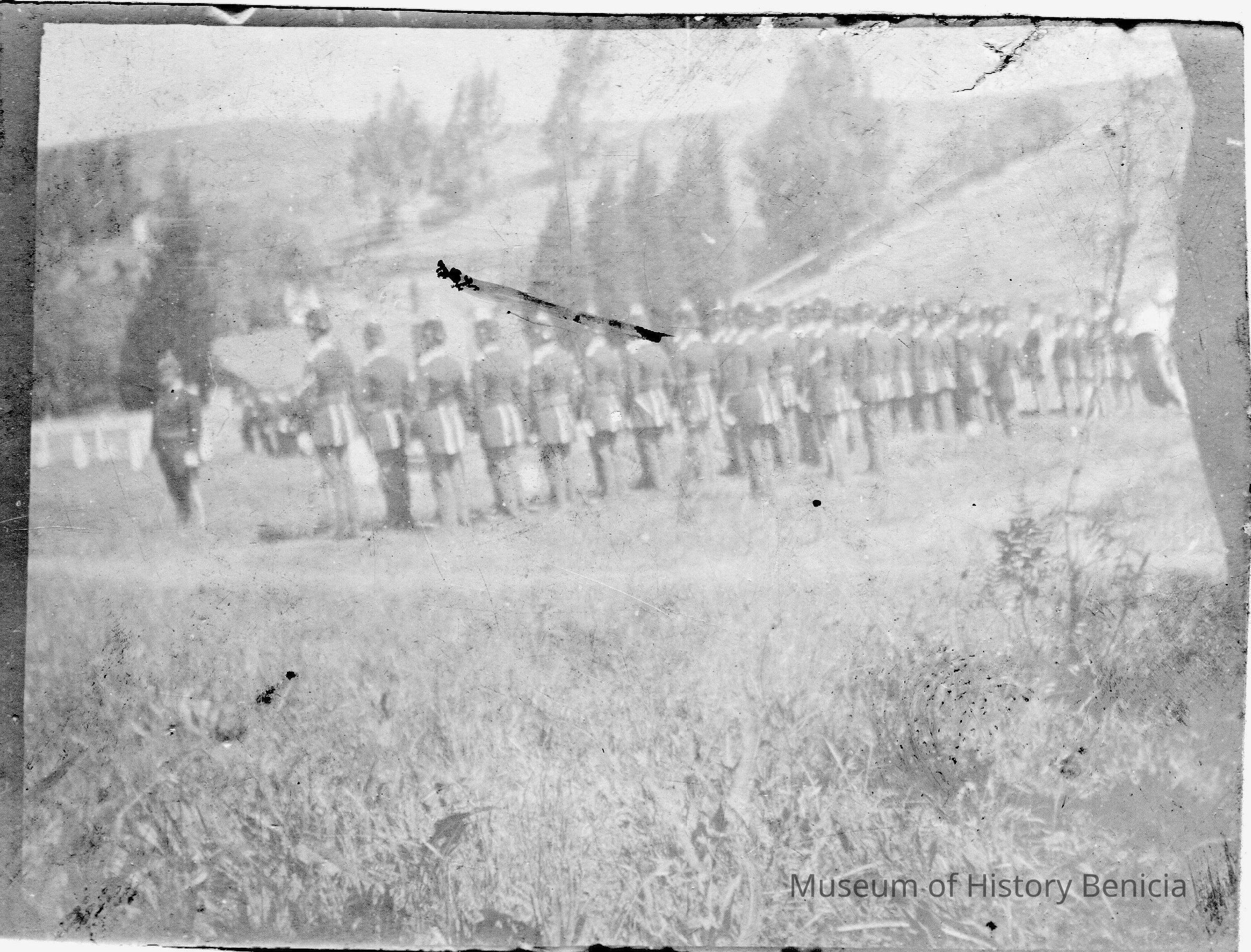 Photo of men on a parade ground. Looks like Benicia Barracks area or the military cemetery. Seems to be an old photo.