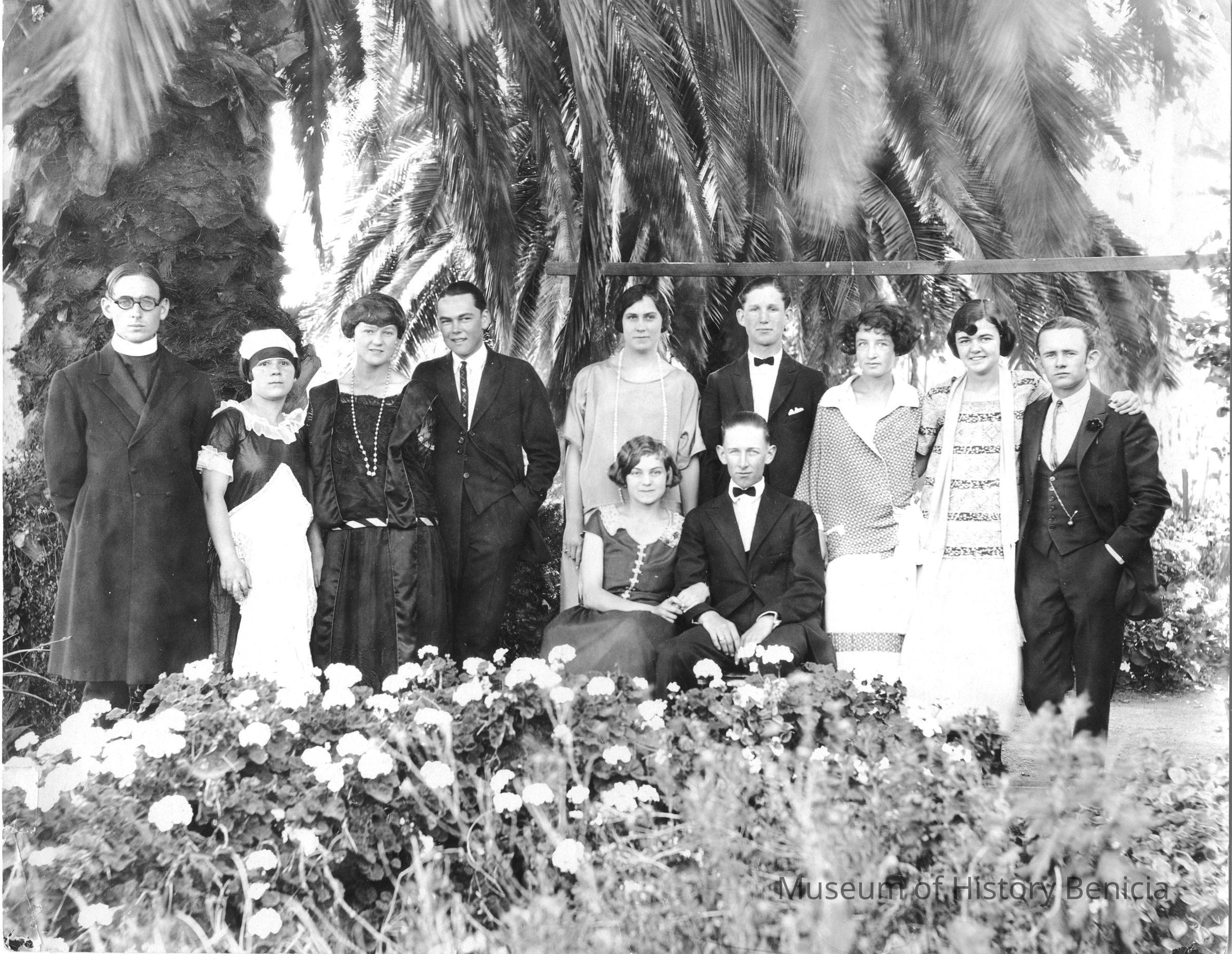 Large photo of a group of people. Looks like a wedding photo. The woman in the front center is Violet Molfino. This could be her wedding to Percy Wilson. Or this could be a students from a local play. Violet was married rather late in life to Percy Wilson and in this picture she looks too young.Collection