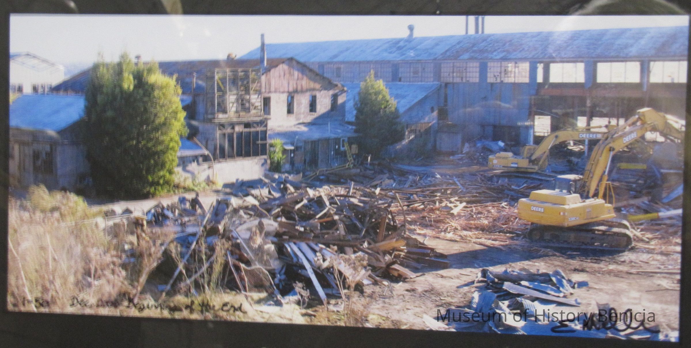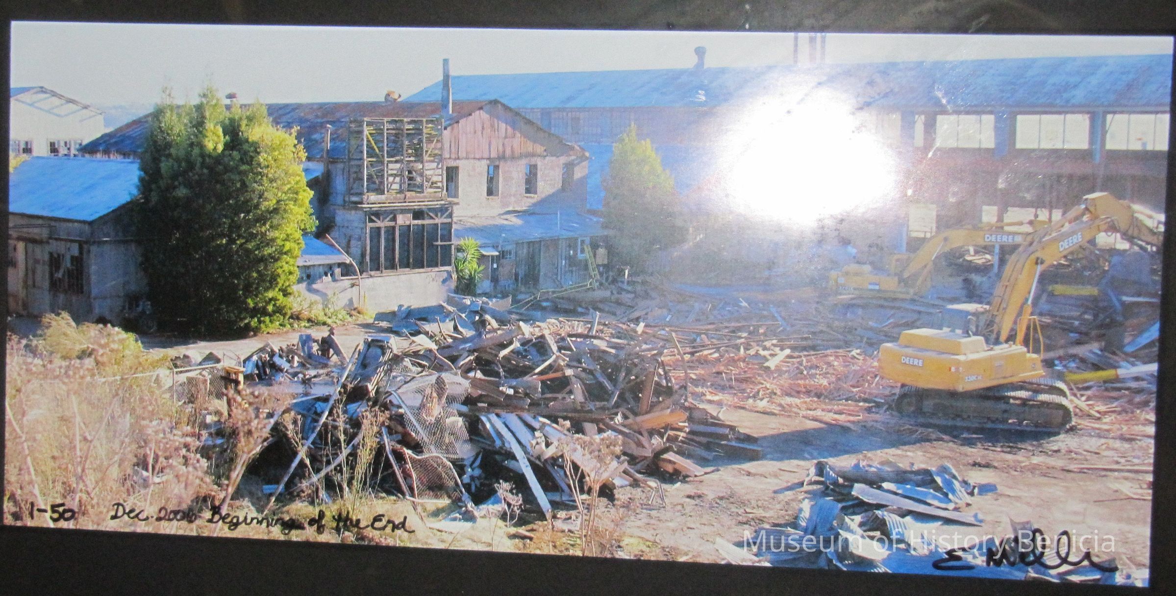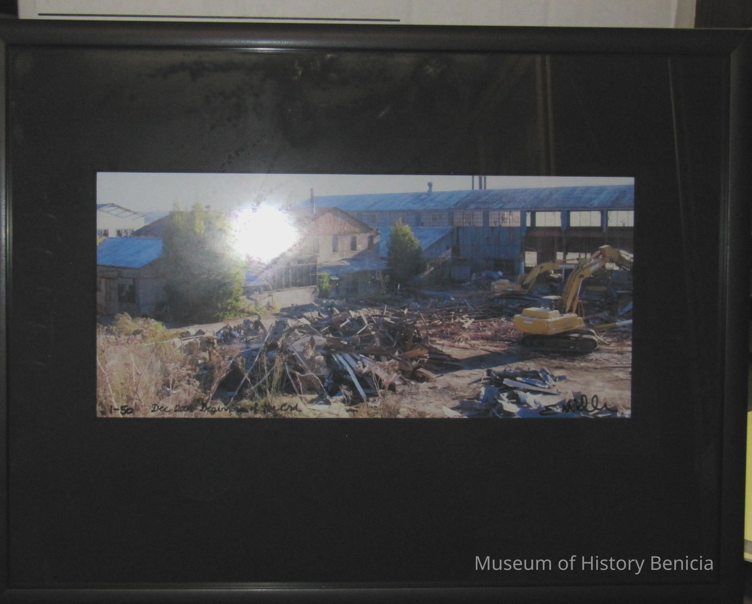 Framed and matted color photograph of the razing of Yuba mfg. property by E. Miller.