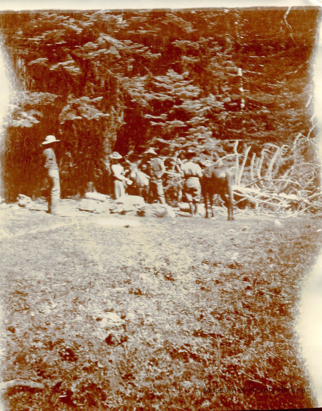 A photo of a mountain meadow with riders and horses.