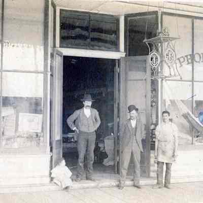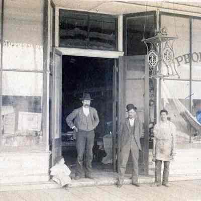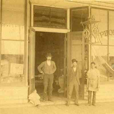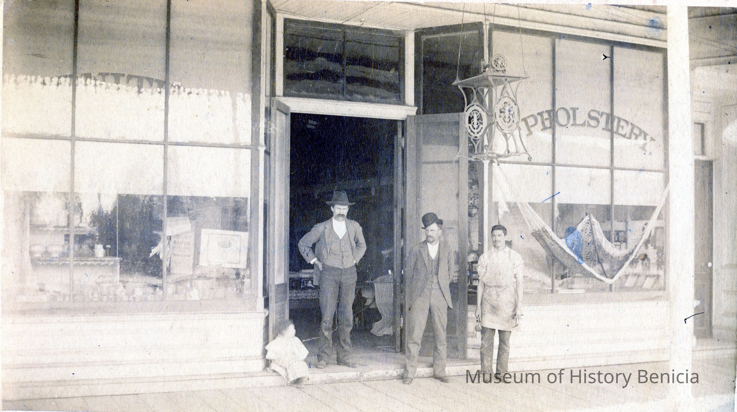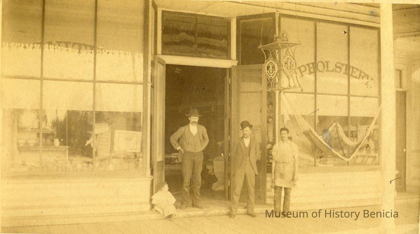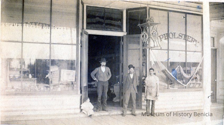 This is a photo of the Teale and Parker furniture store in Benicia. It shows "Uncle George Teale, Papa, Al Silva and Chester". The store is at West "I" street and First based on the related photo (2014.011.0133). That photo also shows the destruction of the store in a fire on 07/22/1894. This photo must pre-date 1894. "Papa" is identified as Ira Stuard (05/05/1854) and Chester, the small boy sitting to the left, is Chester Teale (DOB 1889).Collection