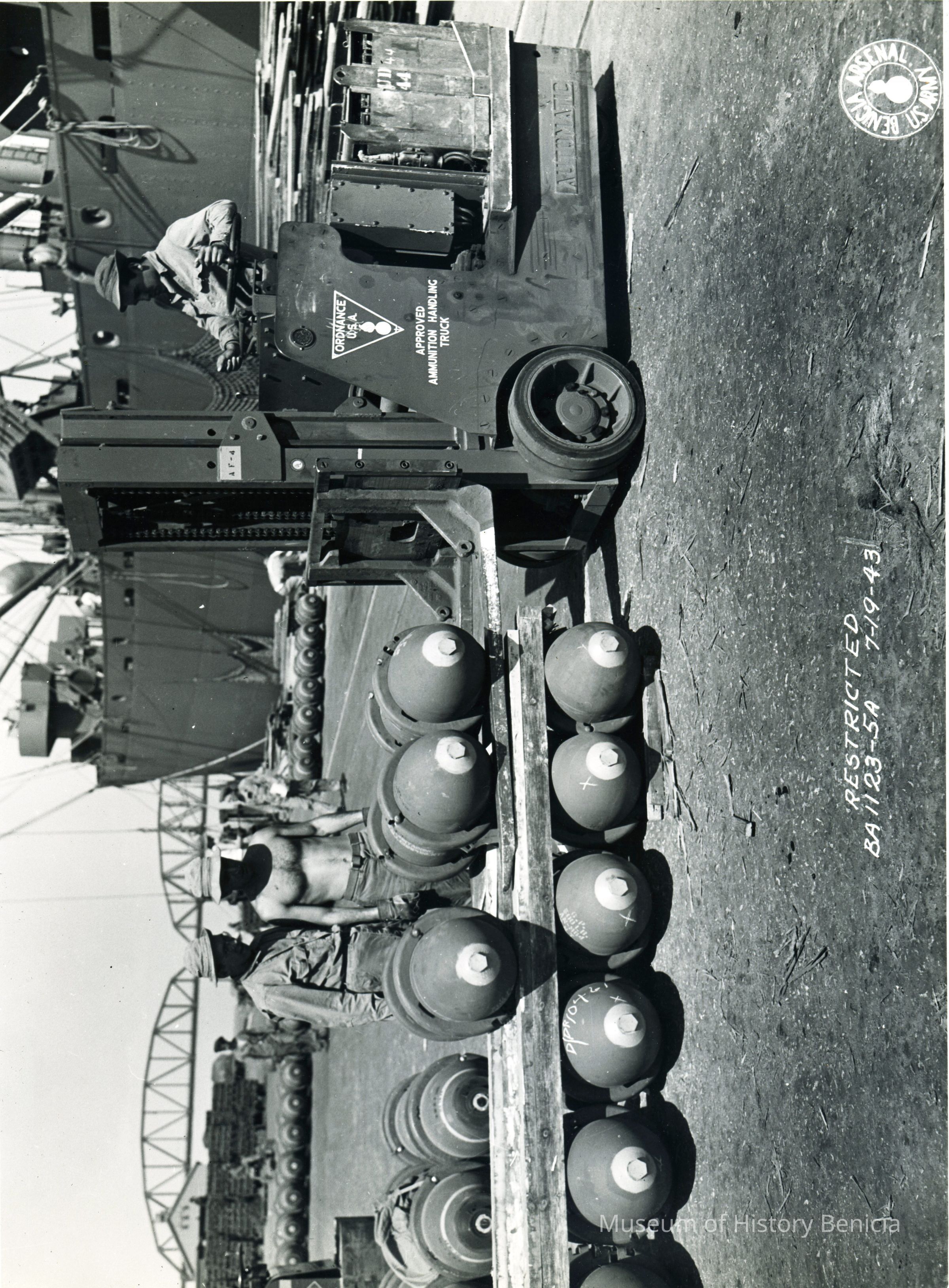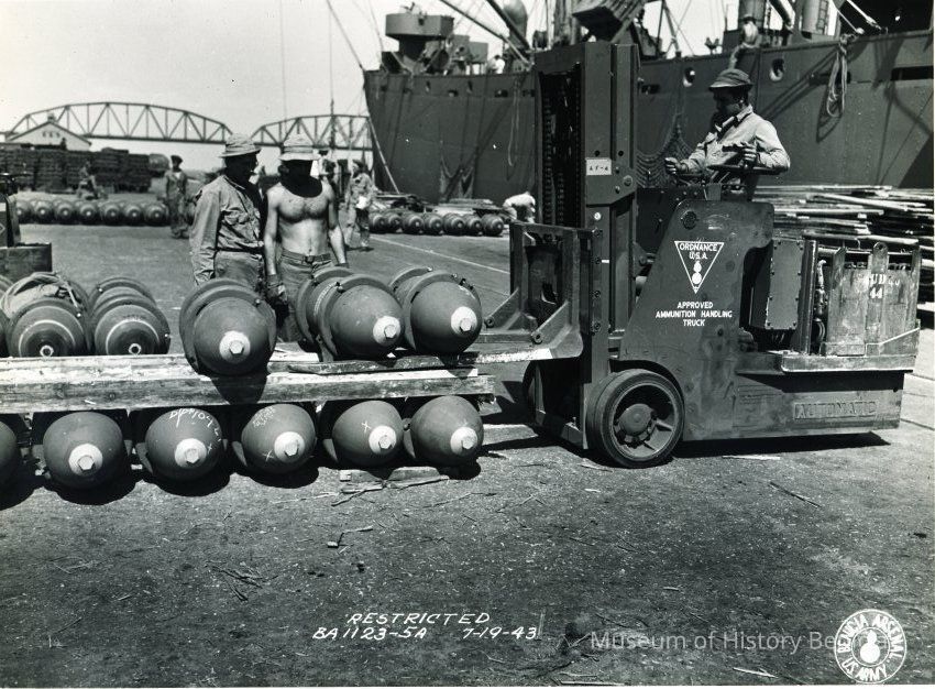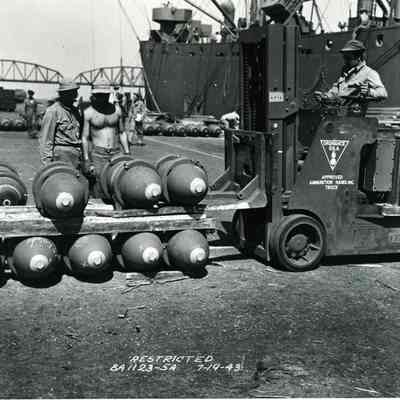 Photo from the Josephine Cowell research material. Shows the moving of bombs with a "approved ammunition handling truck".