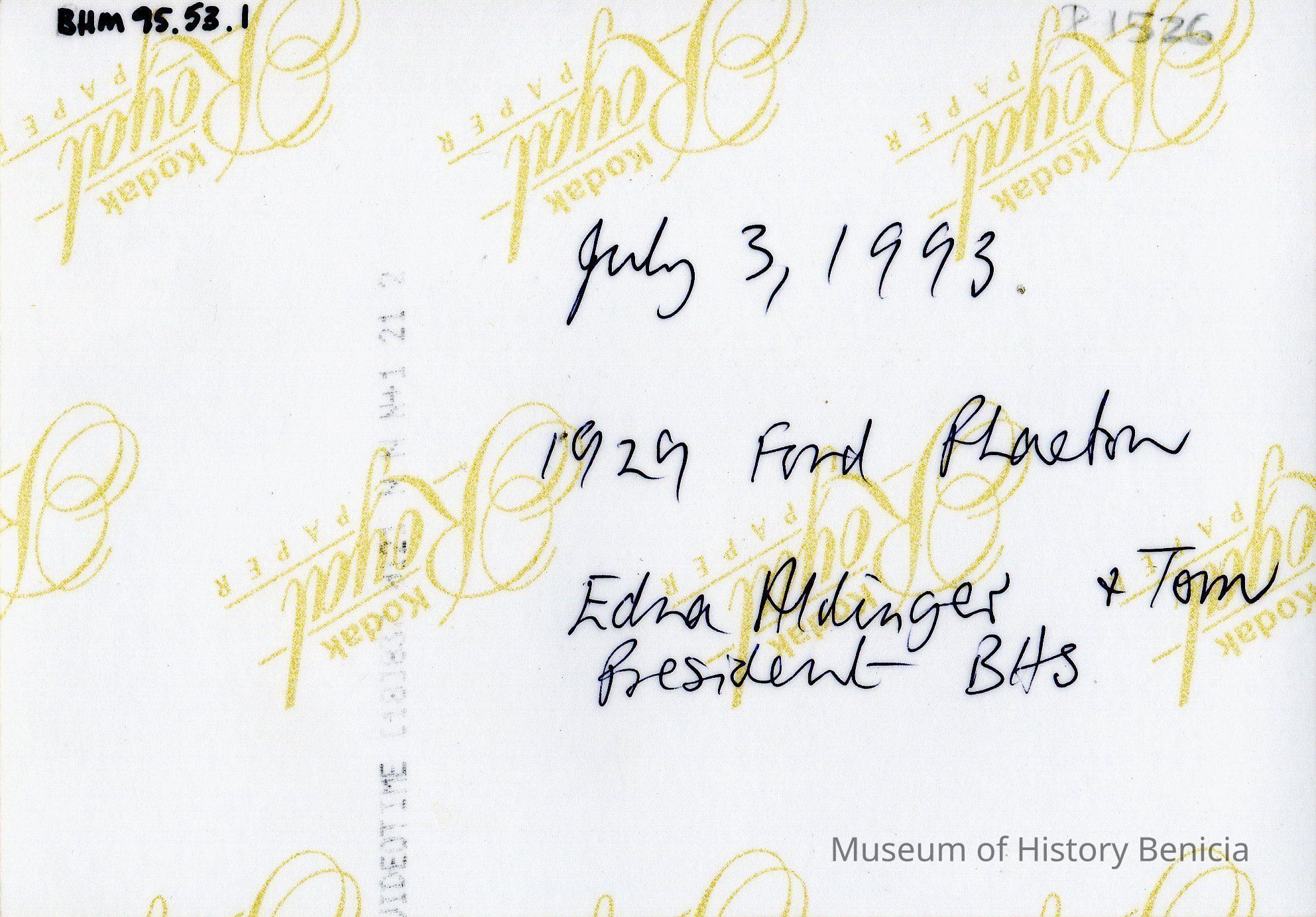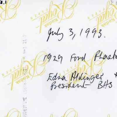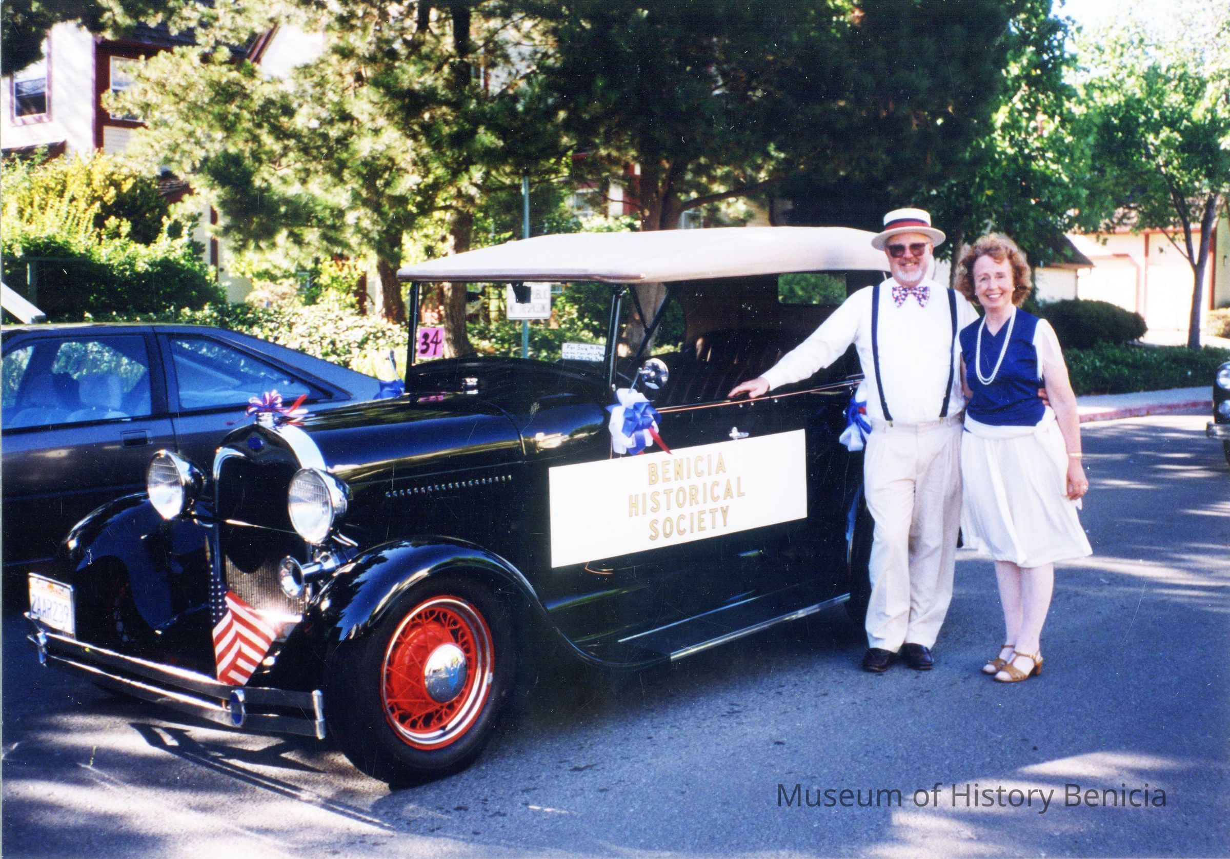 B/W photo of Tom and Edna Aldinger standing next to a 1929 Ford during the July 3, 1993 Fourth of July celebration. The car served as their "float" during the parade, representing the Benicia Historical Society, of which Tom is the president.Collection