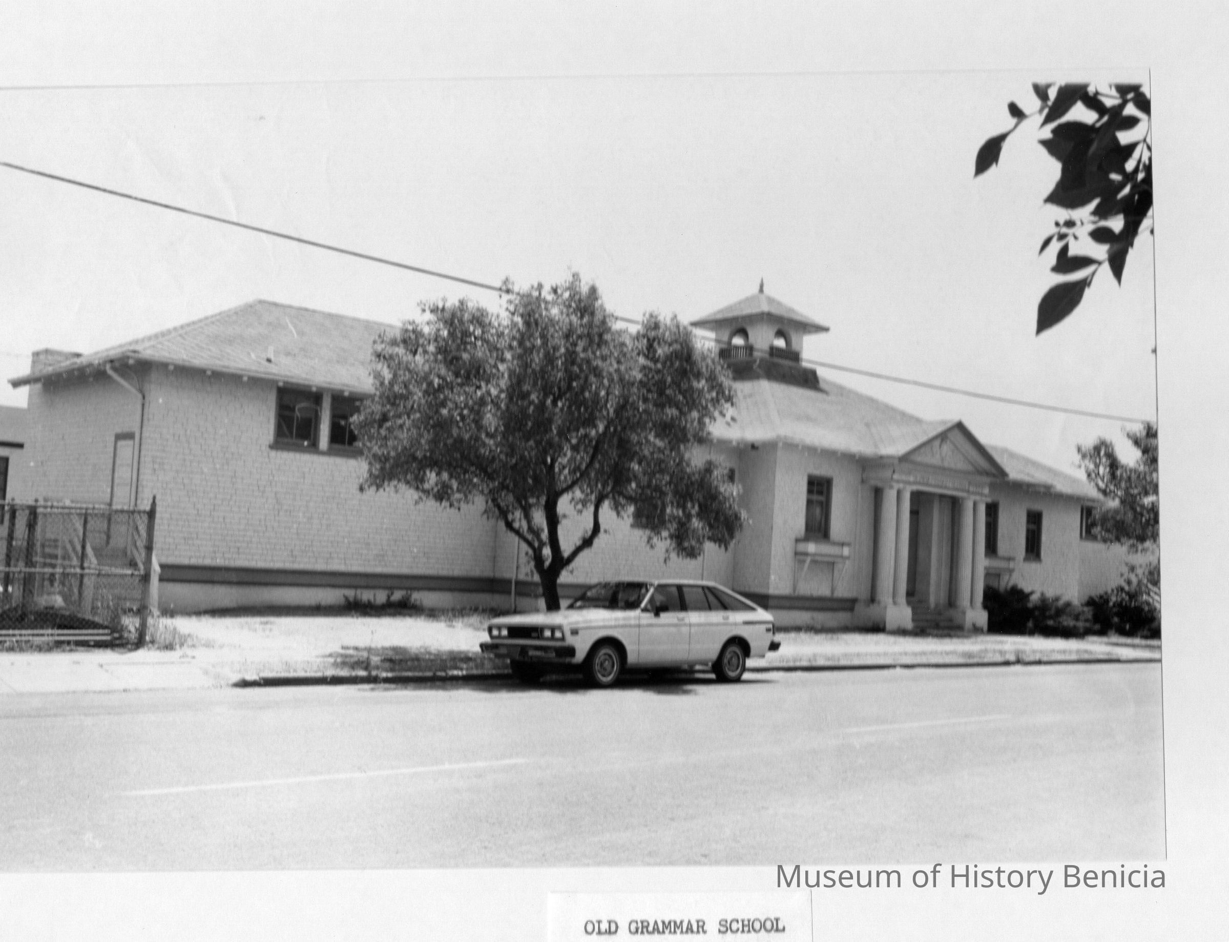 B/W photograph originally under glass in a black frame with gold trim. The photograph is glued to a mat board. The caption reads: "Old Grammar School". The building has two double columns at entry, and a cupola on top. A white hatch-back car is parked in front. The view is at a slight angle from the left. The building is located on East Third Street.Collection
