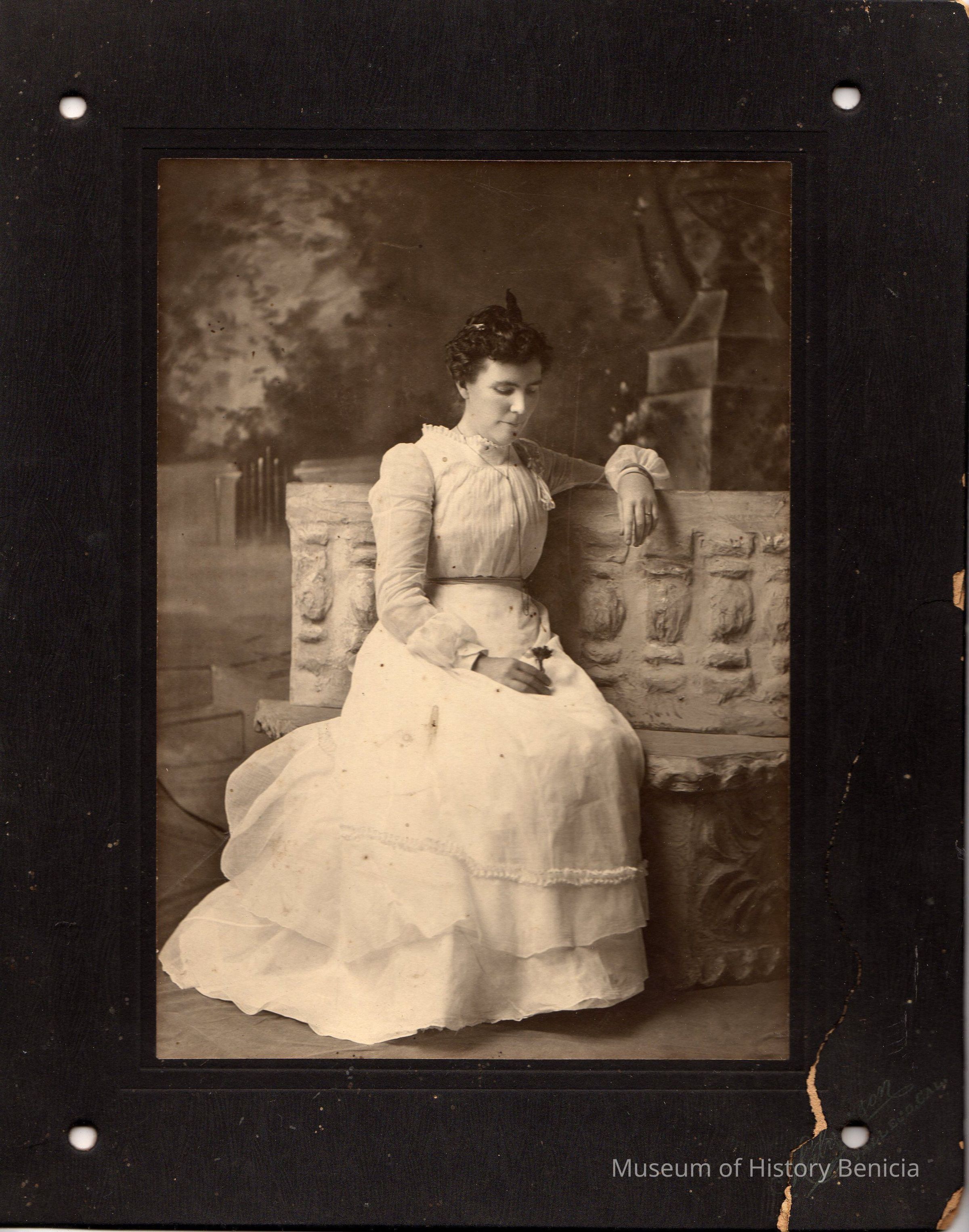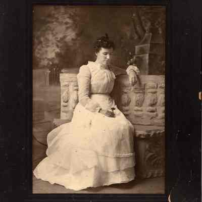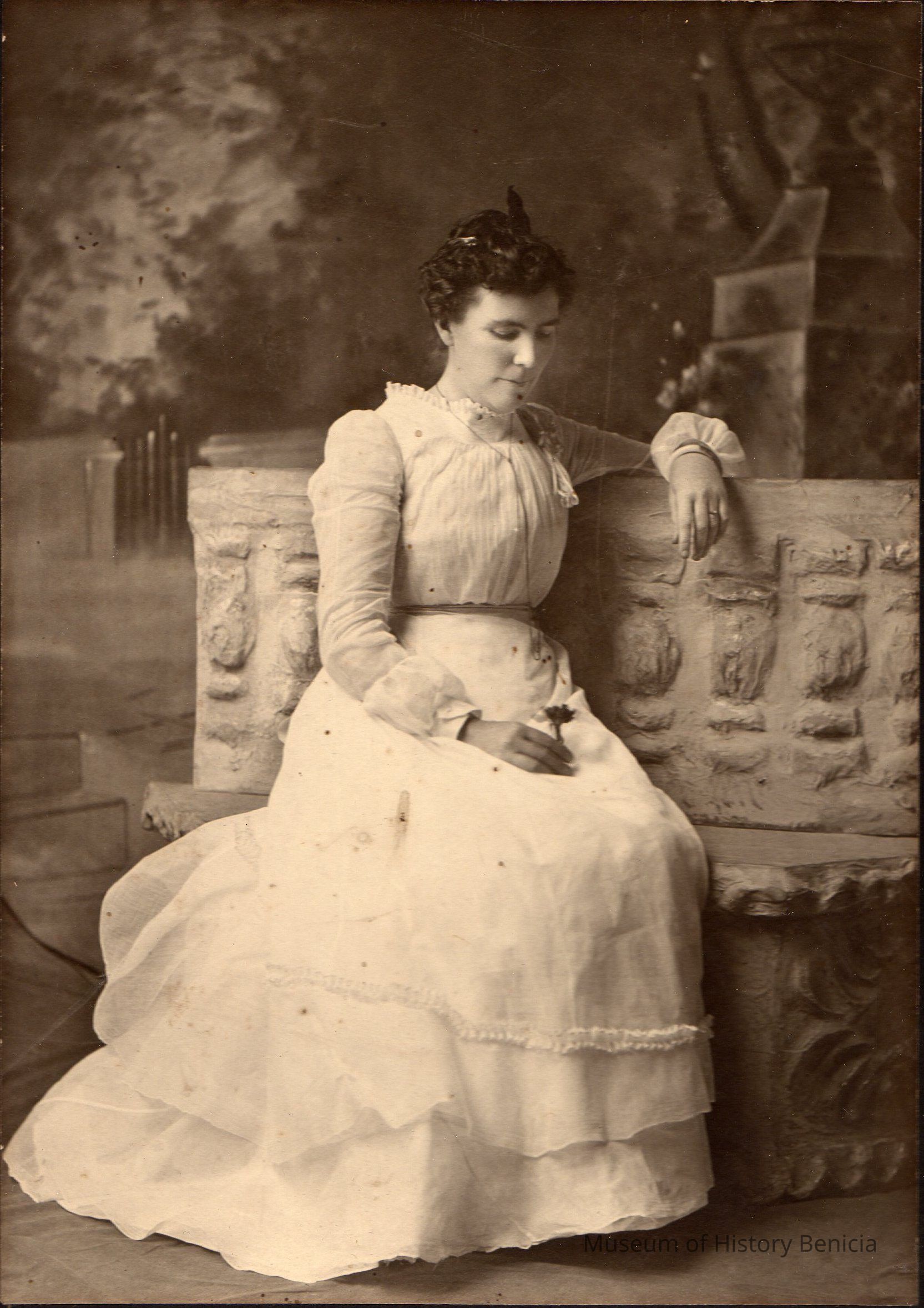 B/W photograph of an unidentified woman wearing a white dress and looking down at a flower that she is holding.