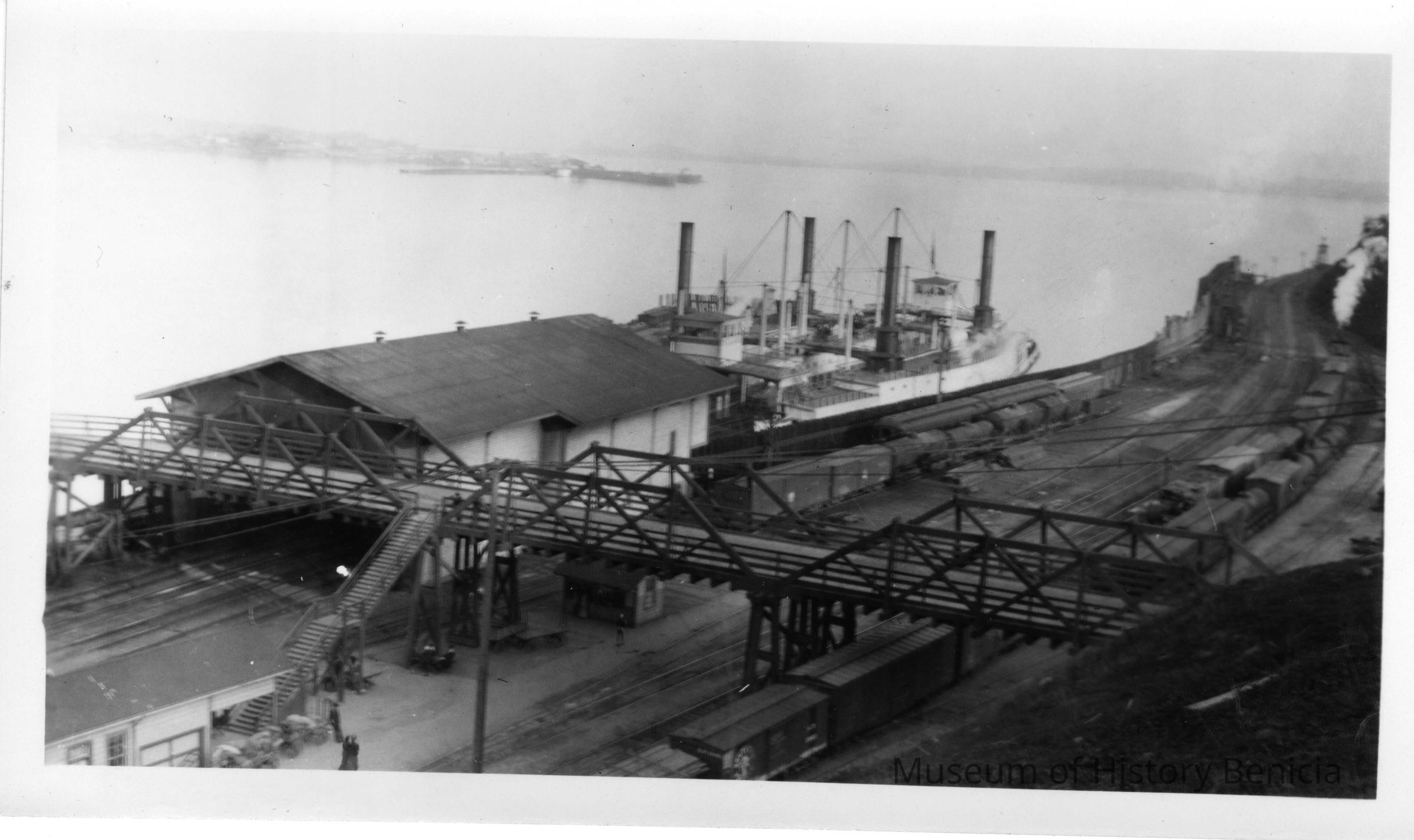 Photograph of train tracks and depot, with ferry (likely Solano) docking. Several pictures in this series have shown this, this one is a little closer than the rest. This is the Port Costa side.