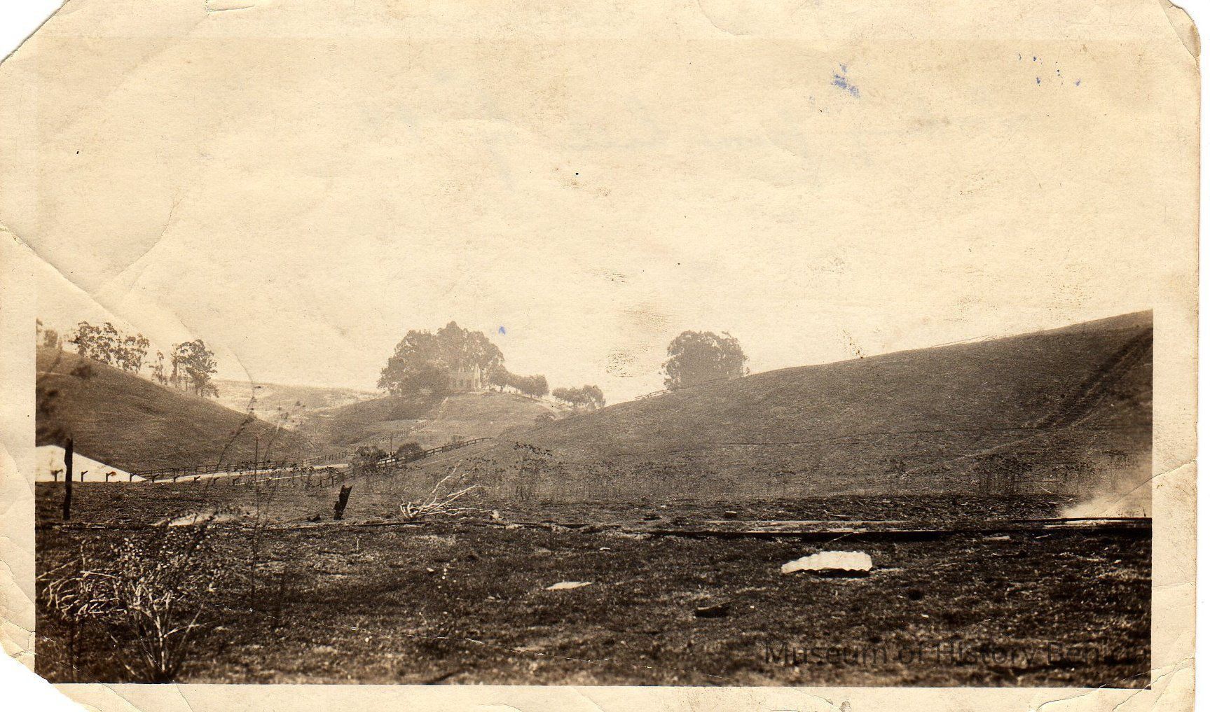 B/W Photograph: "Looking from hill by #94" Rolling hills with trees in the background after the 1922 fire. A building within trees on hill background appears to be Magazine 12, converted cistern. In foreground left is the roof magazine 2; foreground right is a piece of tin roof and a smoking board.Collection
