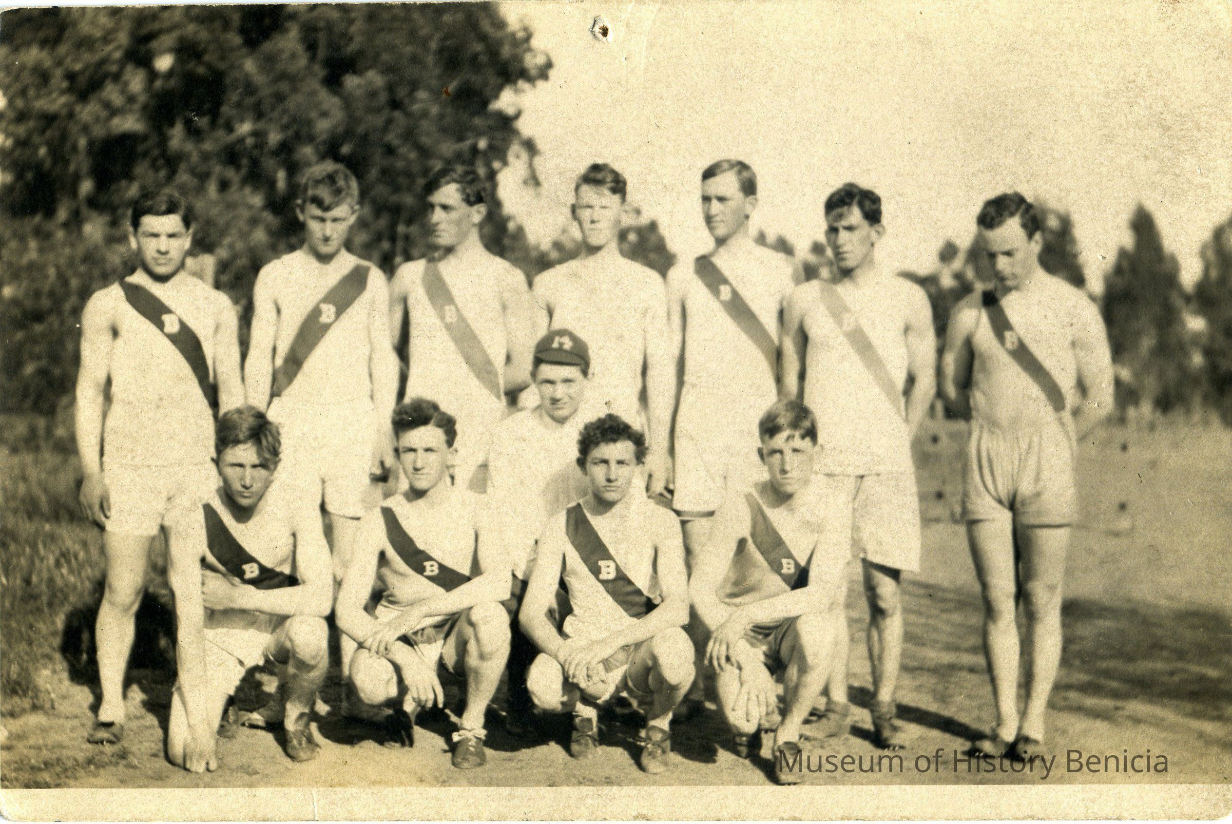 Black and white photo of seven members standing and five members squatting in front of them. They all have a banner across their chests. Third from left, standing, Robert Newell Cutts. Front row third from left: Charles Vernon Dalton.Collection