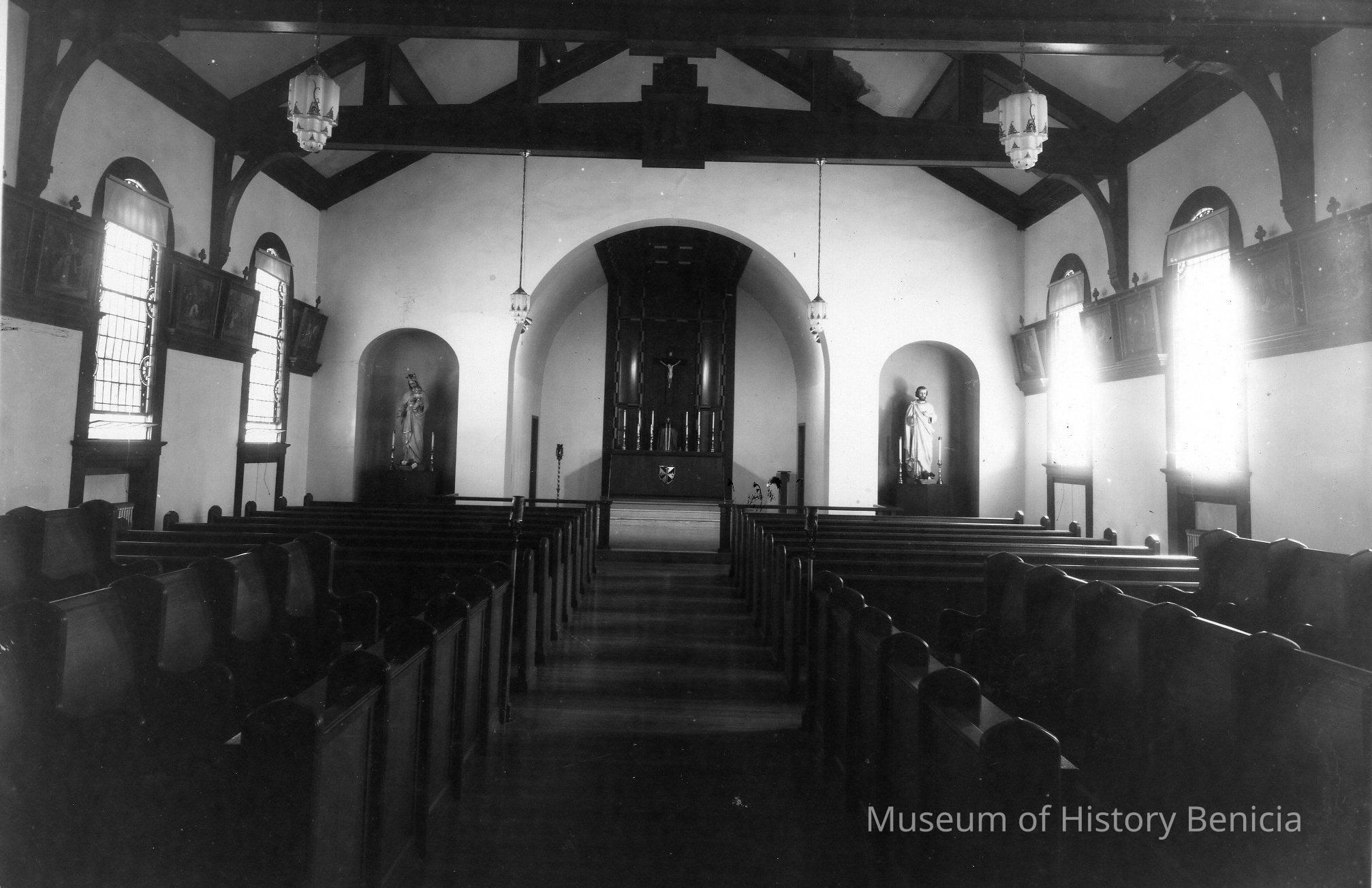 B/W photograph: interior of St. Catherine Chapel. It shows the alter, statues on either side, pews, rafters and leaded glass windows.Collection