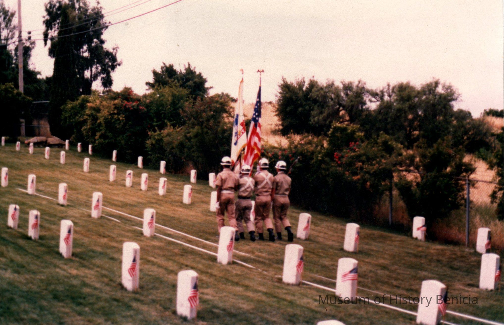 Color Photograph: Four soldiers walking with flags and rifles, Benicia Military Cemetery, at the Memorial Day services, 1983.