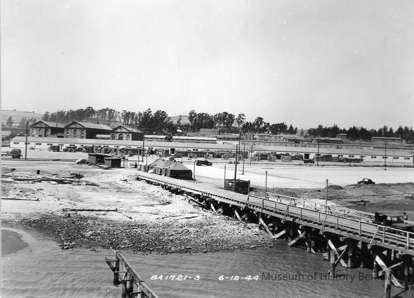 B/W View of buildings and pier (Benicia Arsenal?).