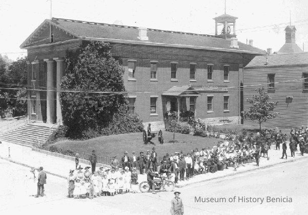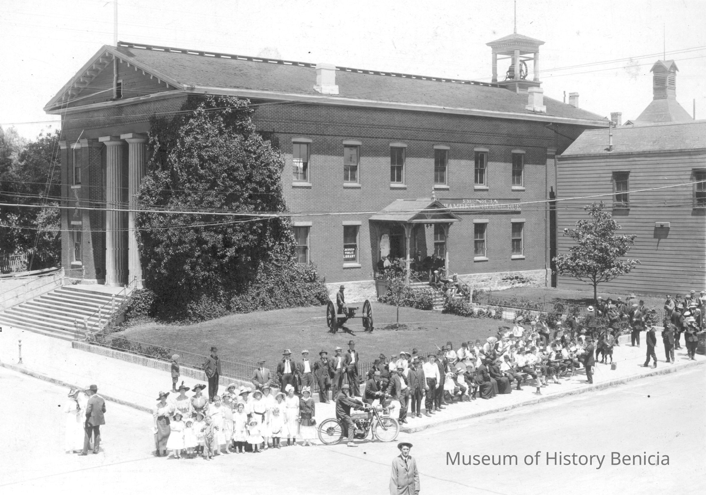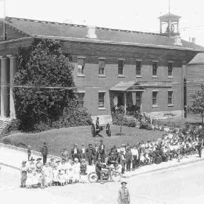 B/W photo of townspeople waiting for a parade. City Hall (Capitol Building) visible; in same building was Chamber of Commerce and library. Fire house on far right.Collection