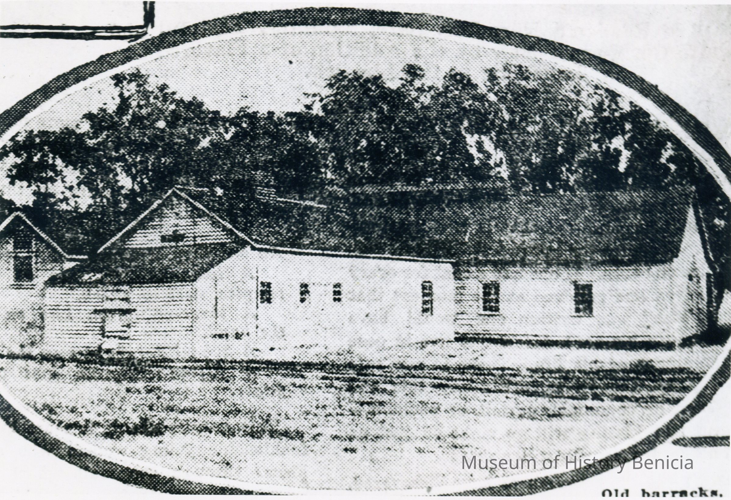b/w photograph of a sketch or photograph of the Benicia Barracks