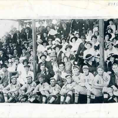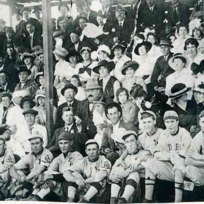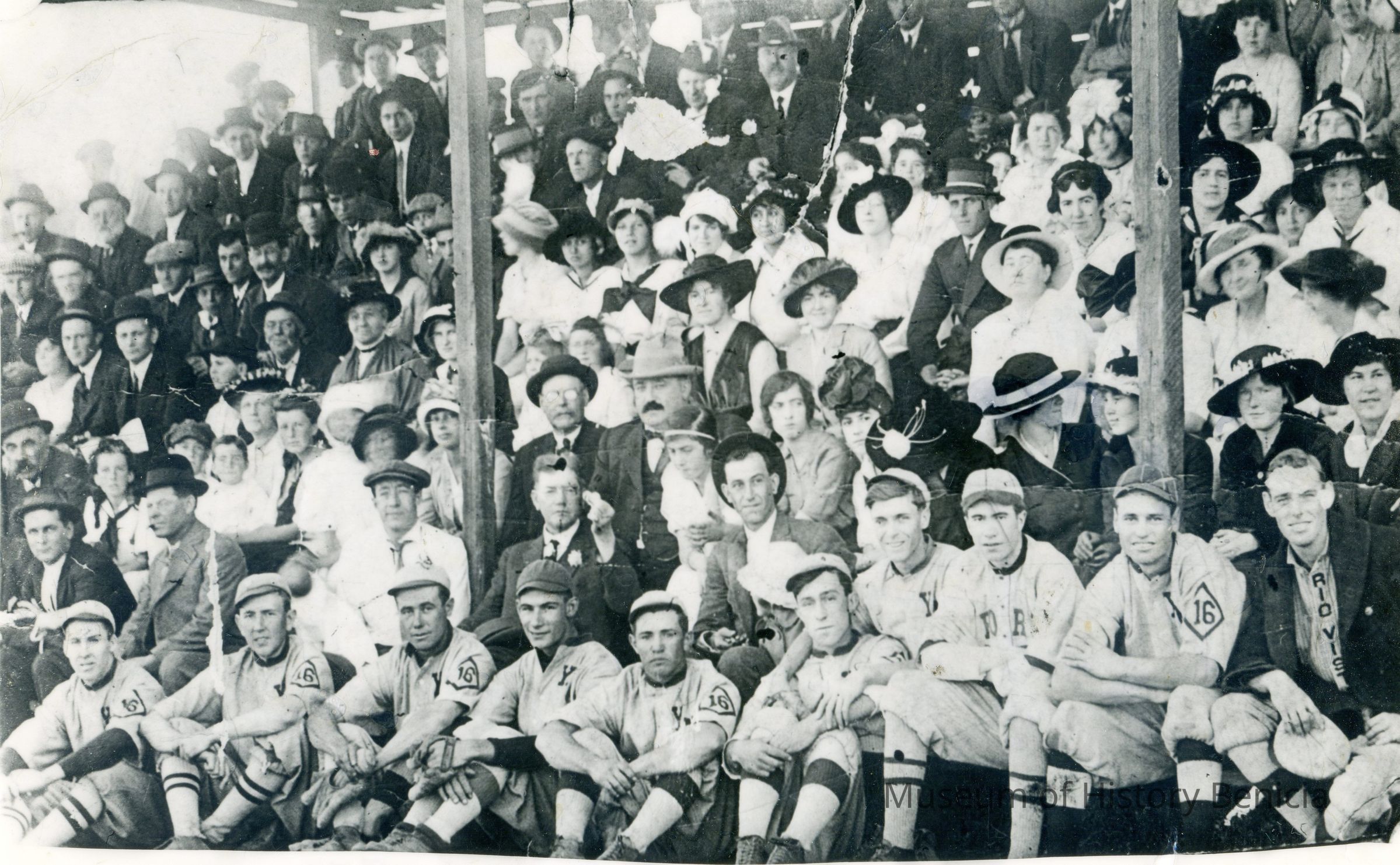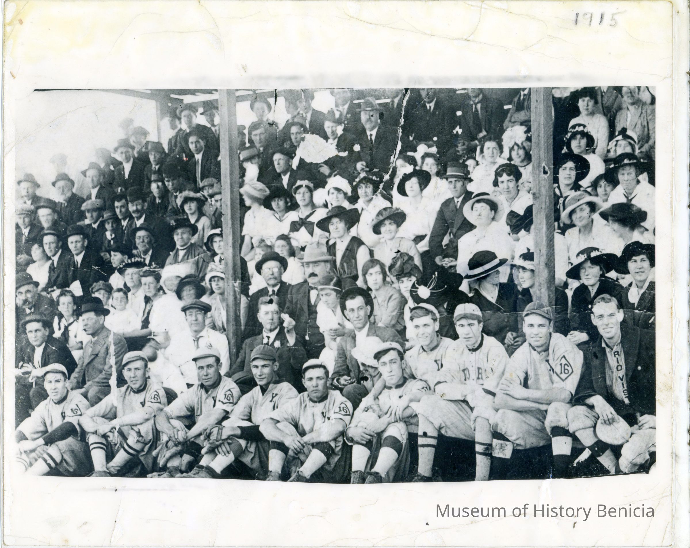 This is a photo of the crowd at a baseball game in Benicia about 1915. In the crowd are several recognizable people. The woman in the black hat sitting behind the gentleman with the light colored brimmed hat and a mostouche, is Grace Quinn a local school teacher. Next to her is a woman from the Passalacqua family. On the far right in the third row is a woman called Esther Sparks. Harry Wassmann says they called her auntie even though she wasn't a blood relation.