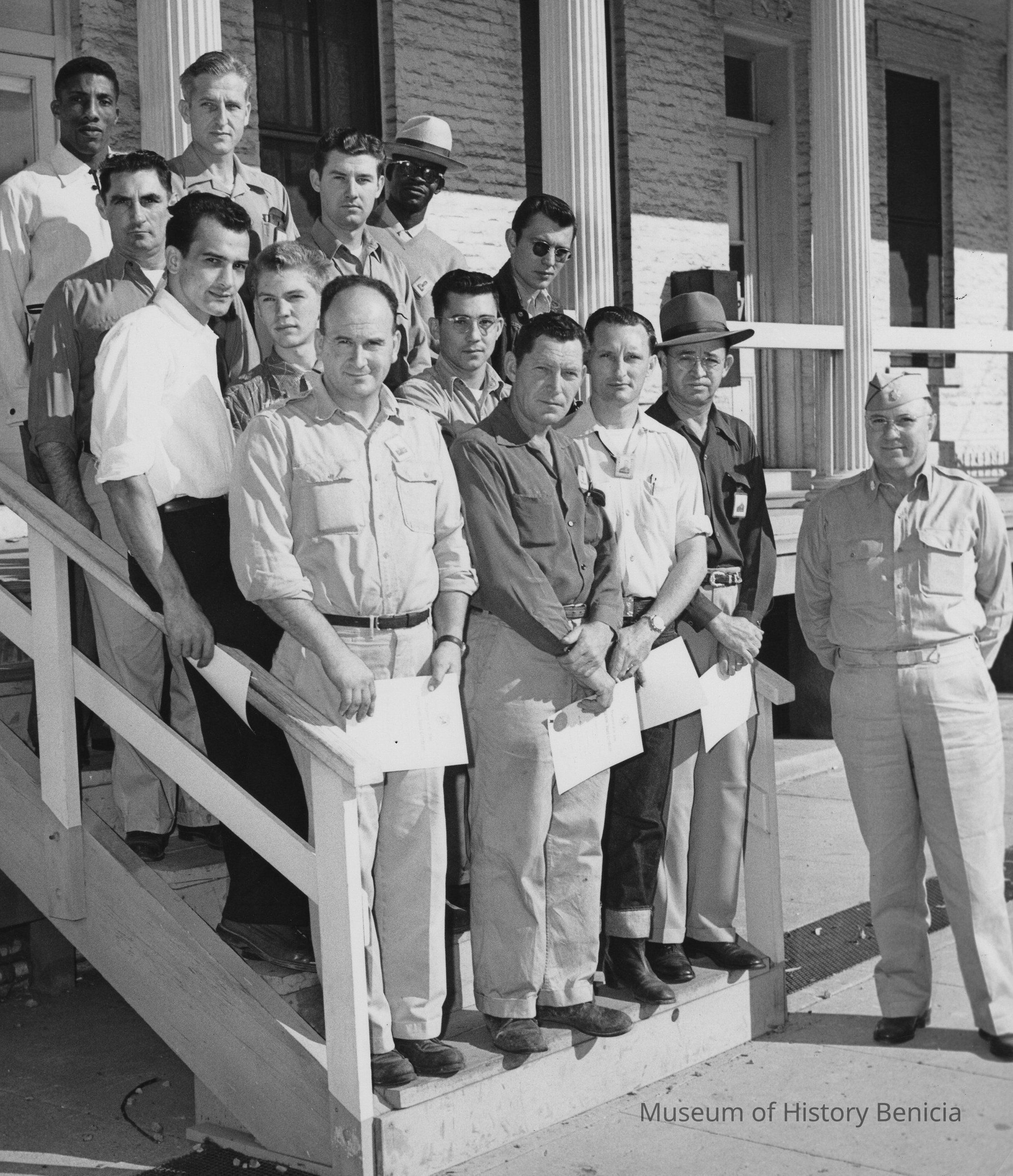 B/W Photograph: group of 13 men on Barracks Bldg. steps. Man in uniform on ground. On back: circled "2" in upper left corner in ink, "04070-316-1 / AM-53", "On steps of Barracks Bldg." in ink, and U.S. Army stamp.Collection