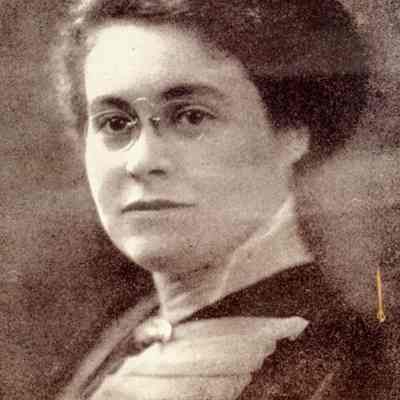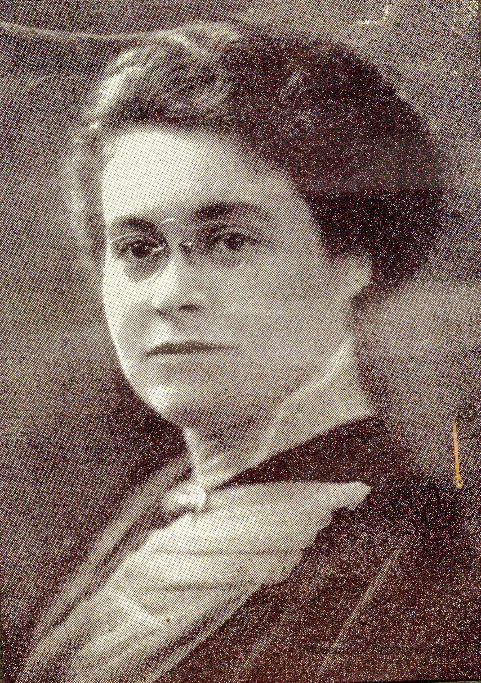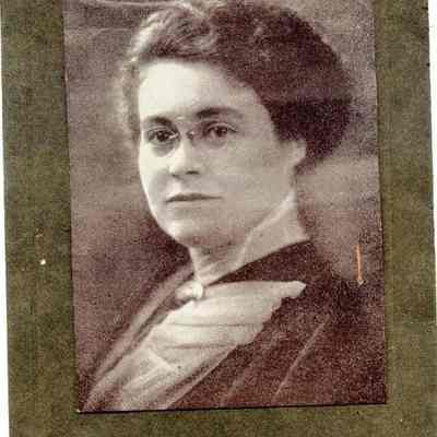 This is a photo from the album described below. It is a paper photo pasted on a black piece of paper of a woman with glasses. It is smaller than the space in the album and was probably in another album originally.