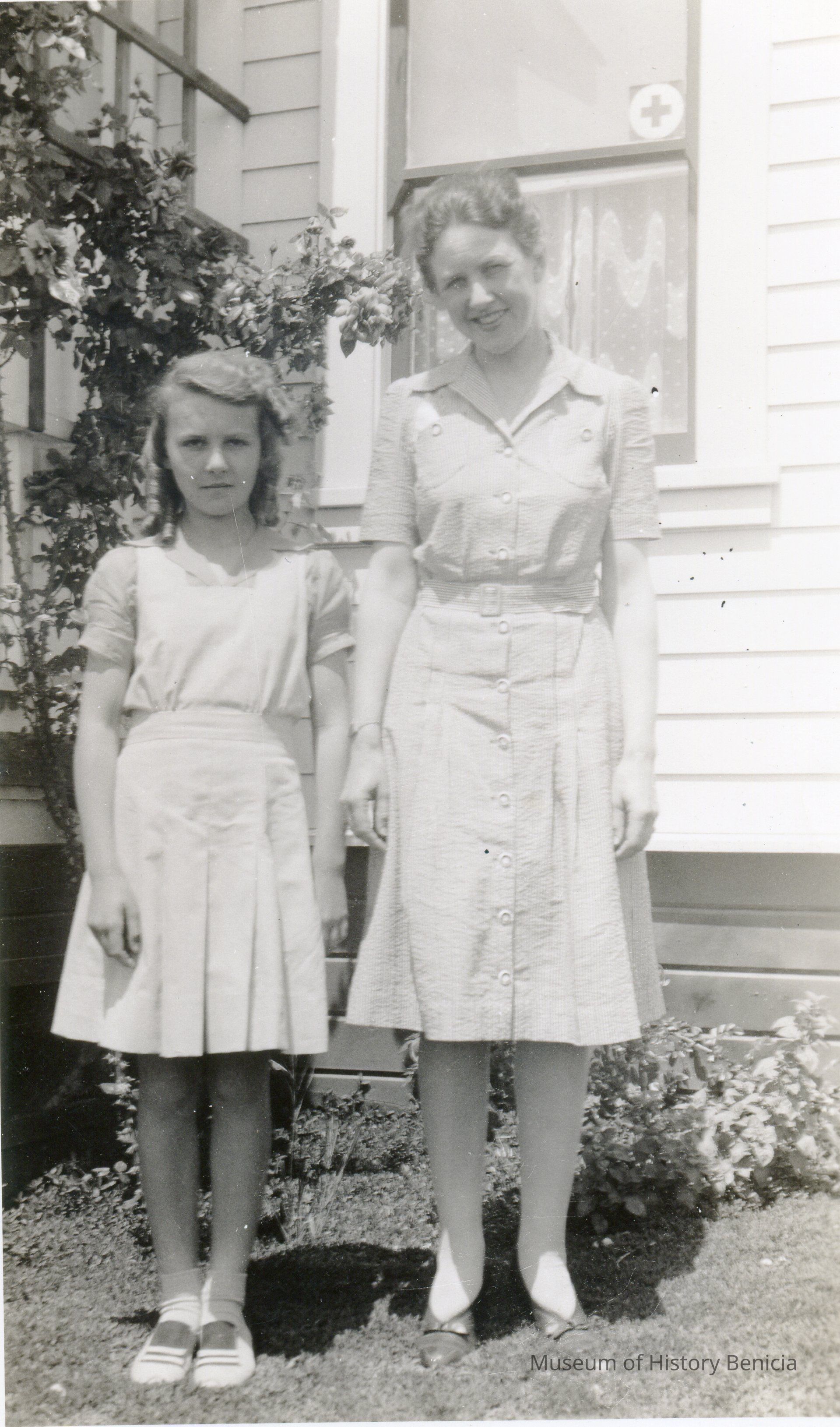 Photo of a woman and a young girl in front of their house. Part of the address reads ?74.
