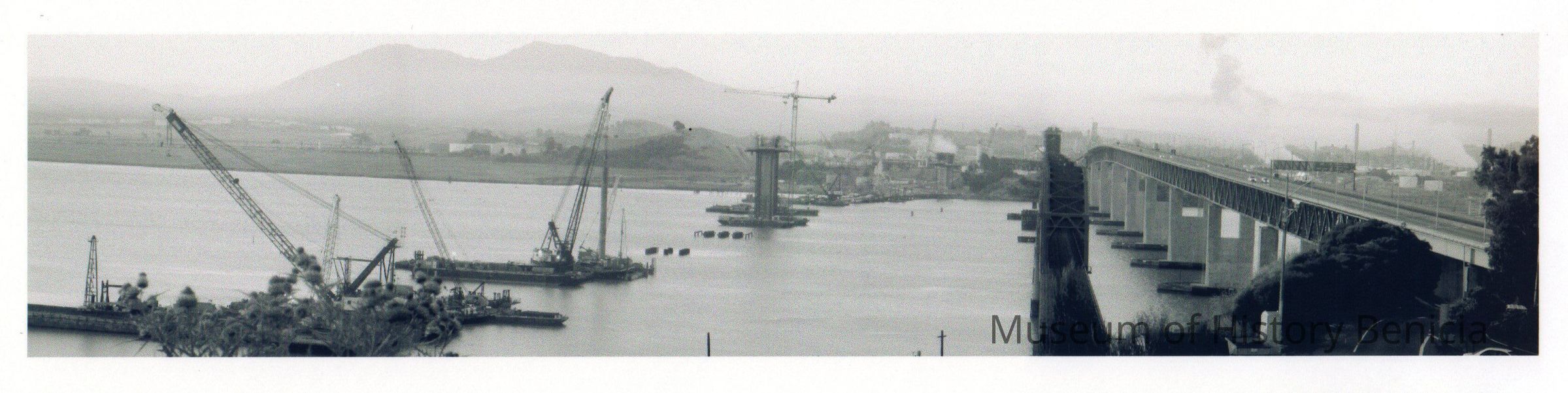 B/W panoramic photograph of the Railroad and Benicia Bridges looking toward Contra Costa, Mt. Diablo is in the distance. Construction on the left is the beginning of the new bridge that will be one way going from Contra Costa to Solano.Collection