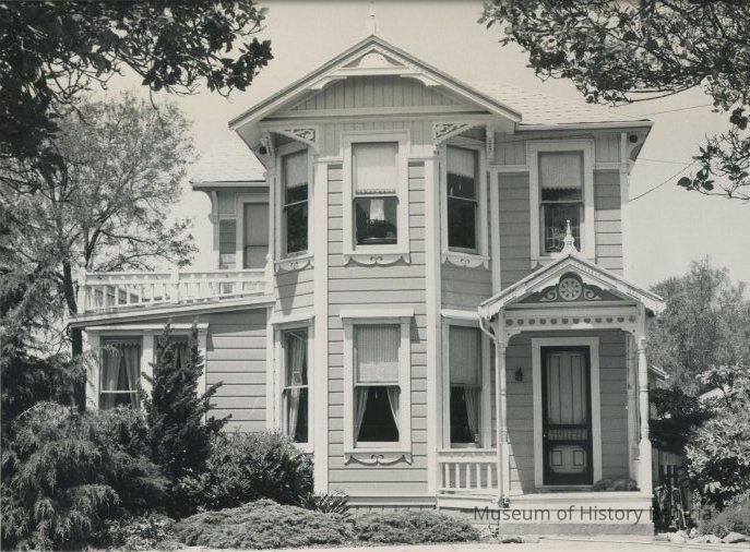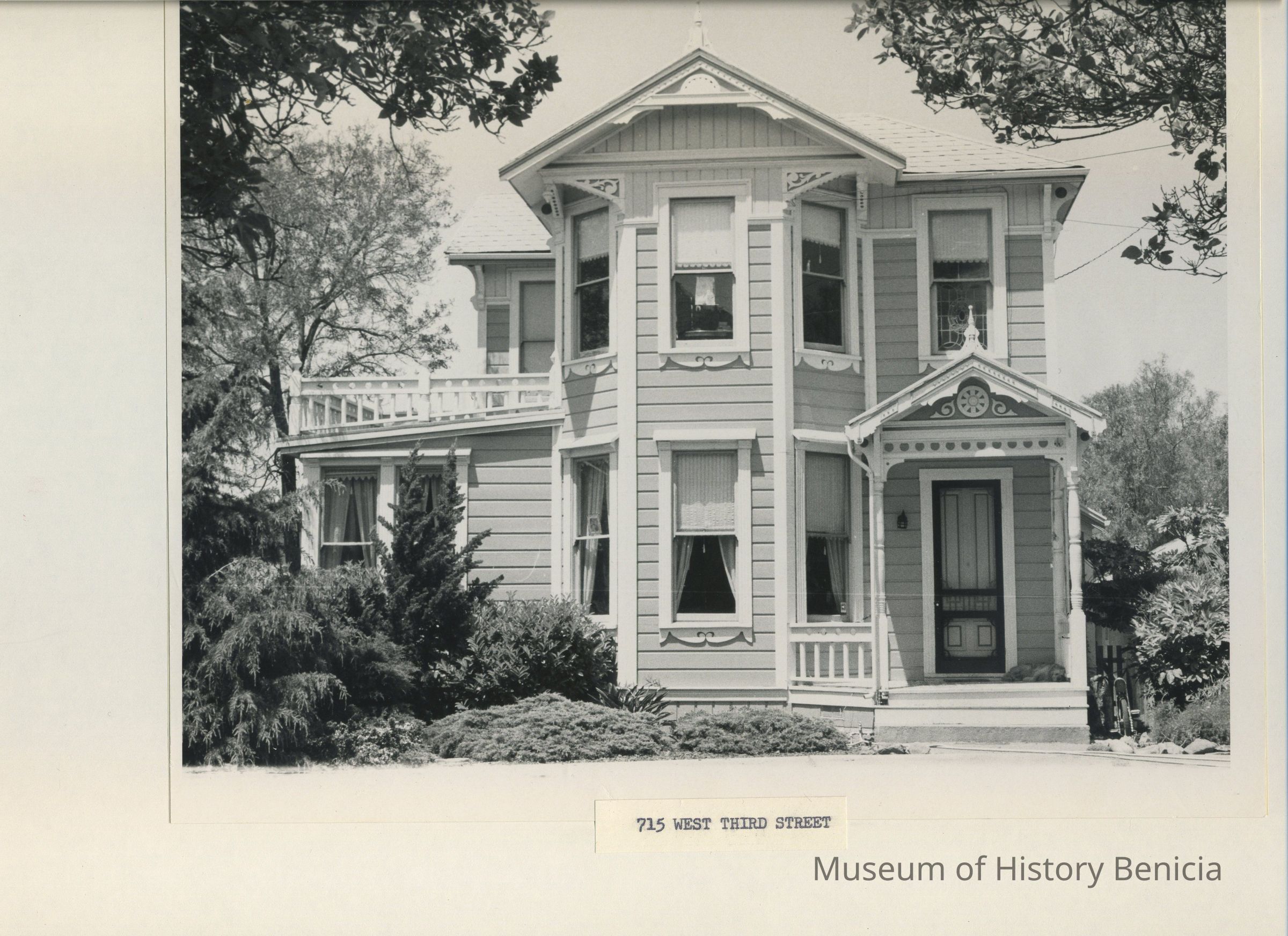 B/W photograph originally under glass in a black frame with gold trim. It is identified as a home at 715 West Third Street: two-story with intricate wood working and mouldingsCollection