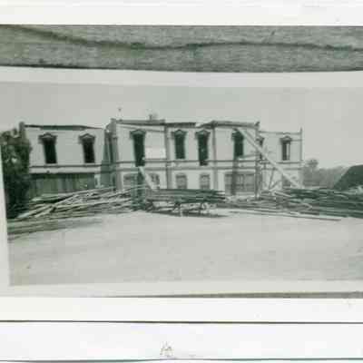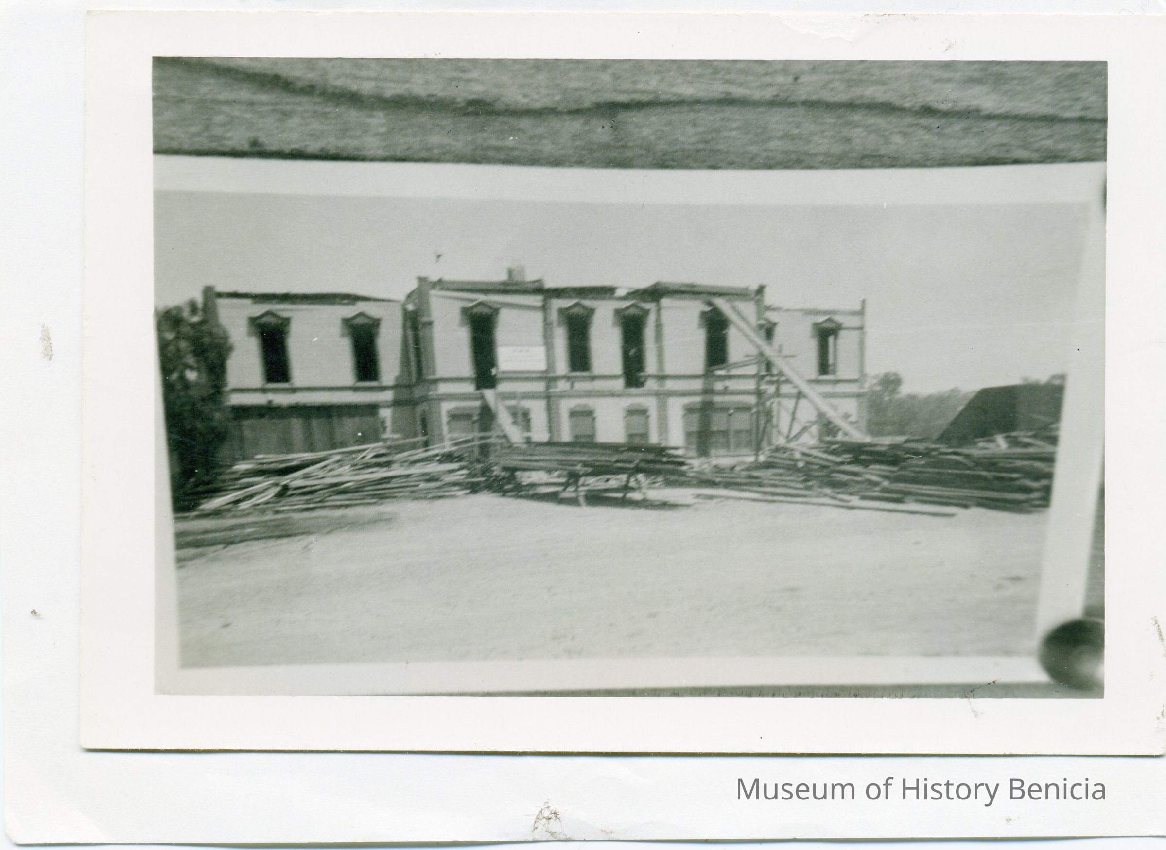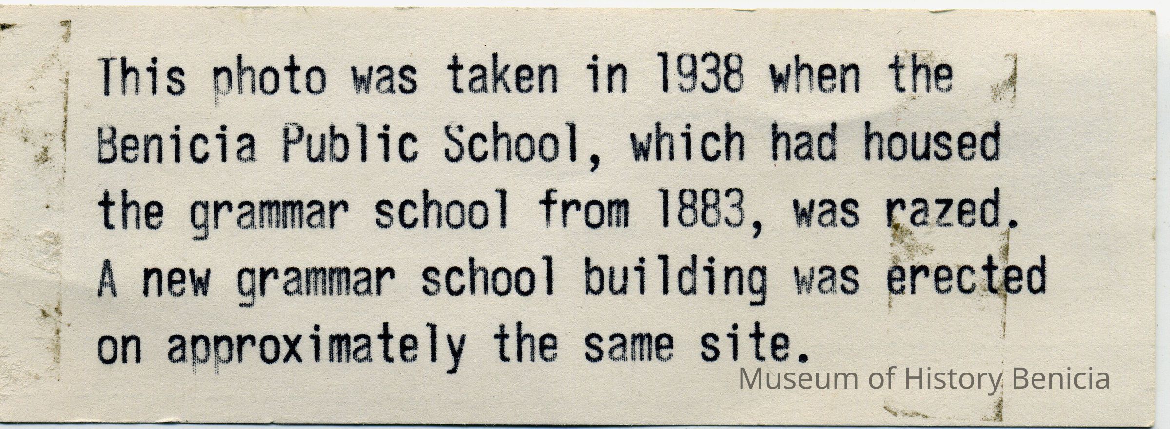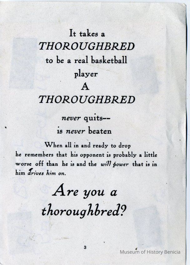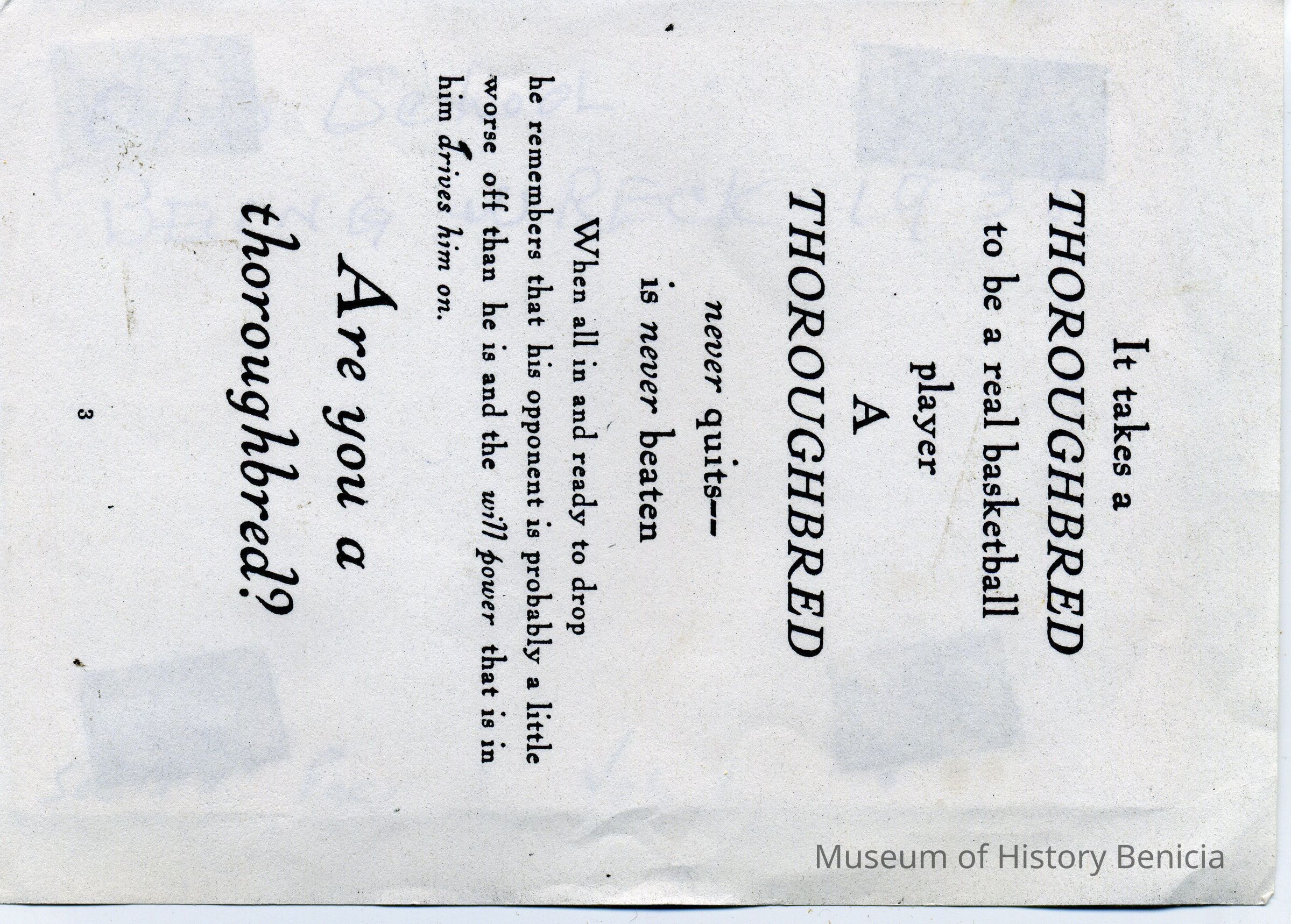 Photo of a photo which shows the old Benicia Grammar school being torn down. There is a information card with the photo that says "This photo was taken in 1938 when the Benicia Public School, which housed the grammar school from 1883, was razed. A new grammar school building was erected on approximately the same site." The photo is glued to a small flyer which says "It takes a Thoroughbred to be a real basketball player..."Collection