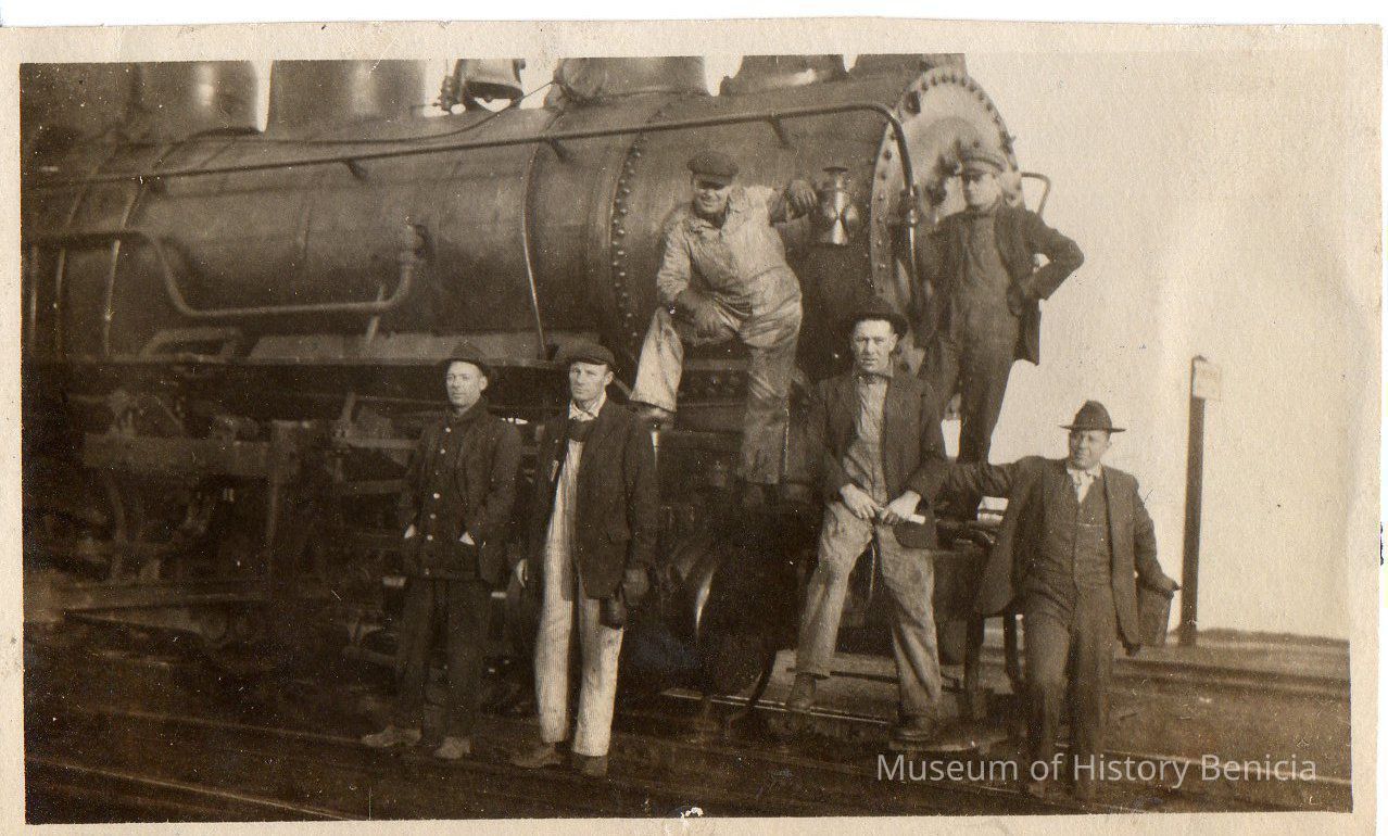B/W photo of train engine #1199 with six men standing in front. Top: engineer and fireman; lower: yard crew, switchman and fireman.