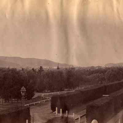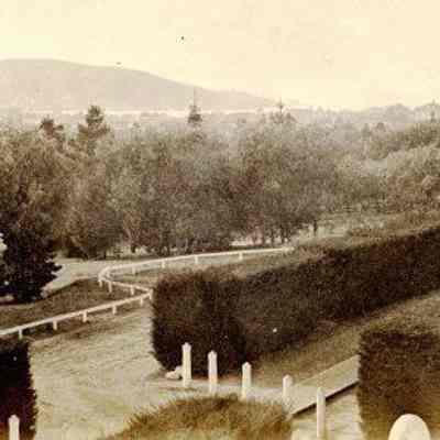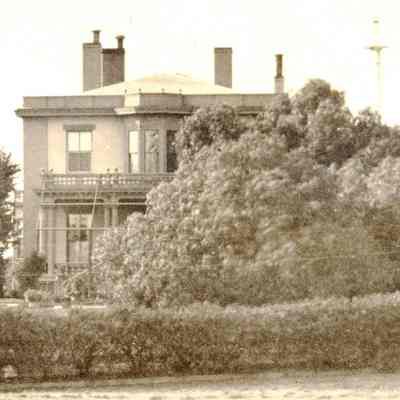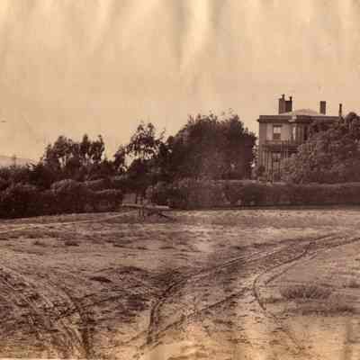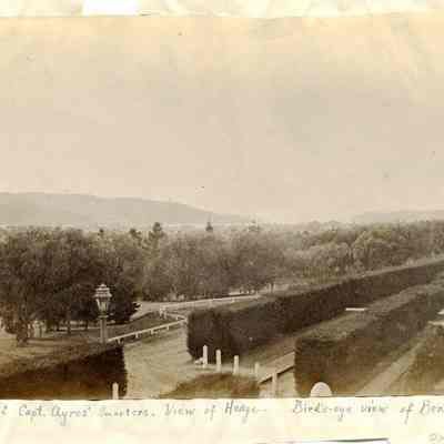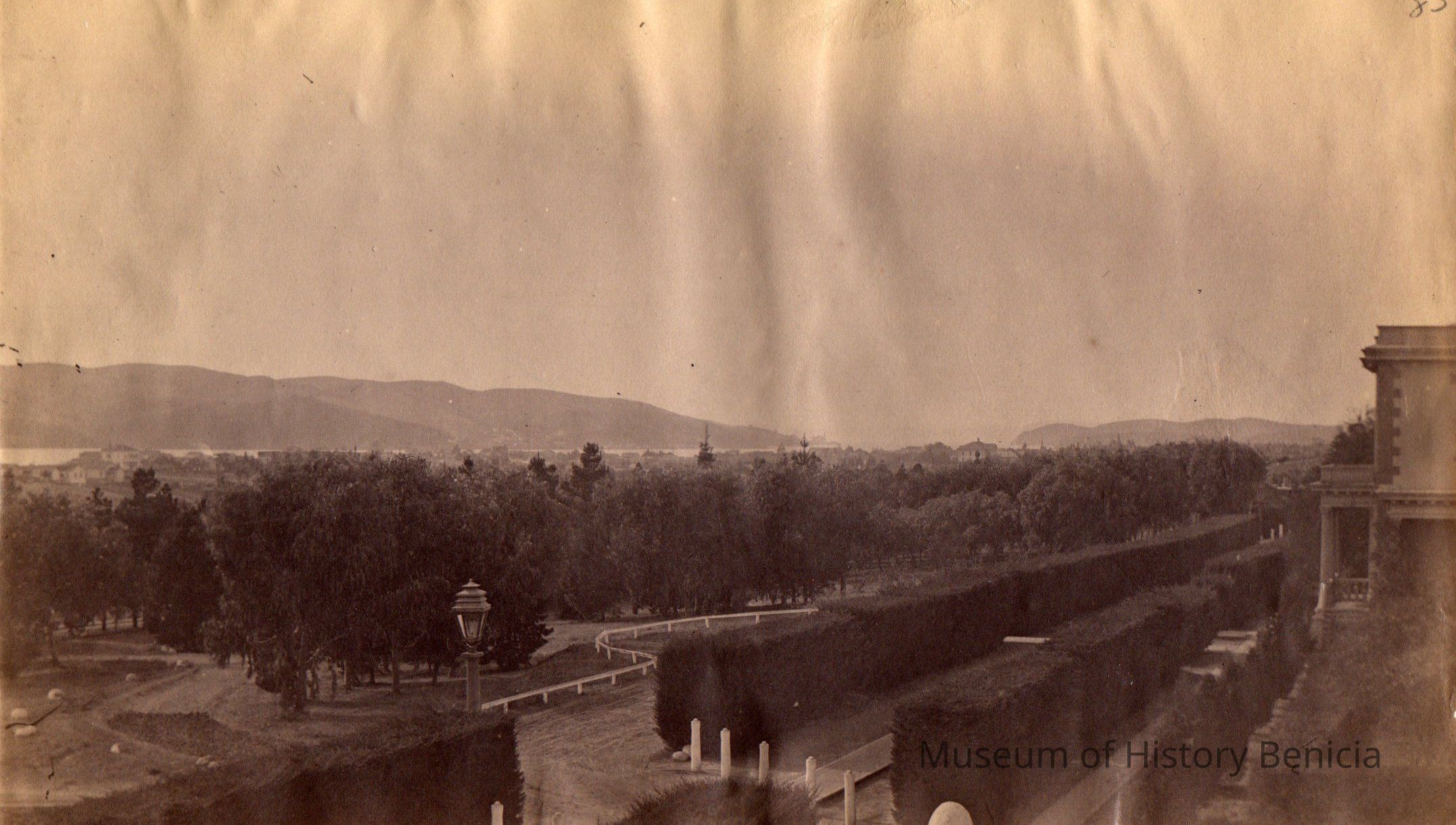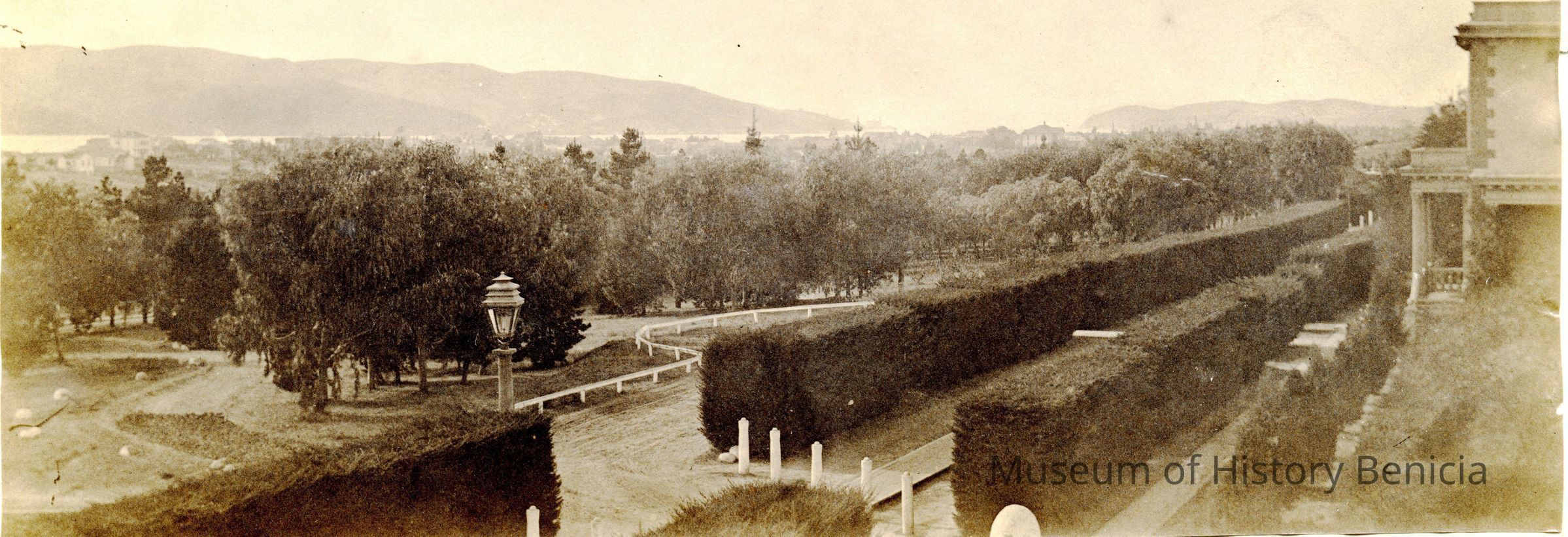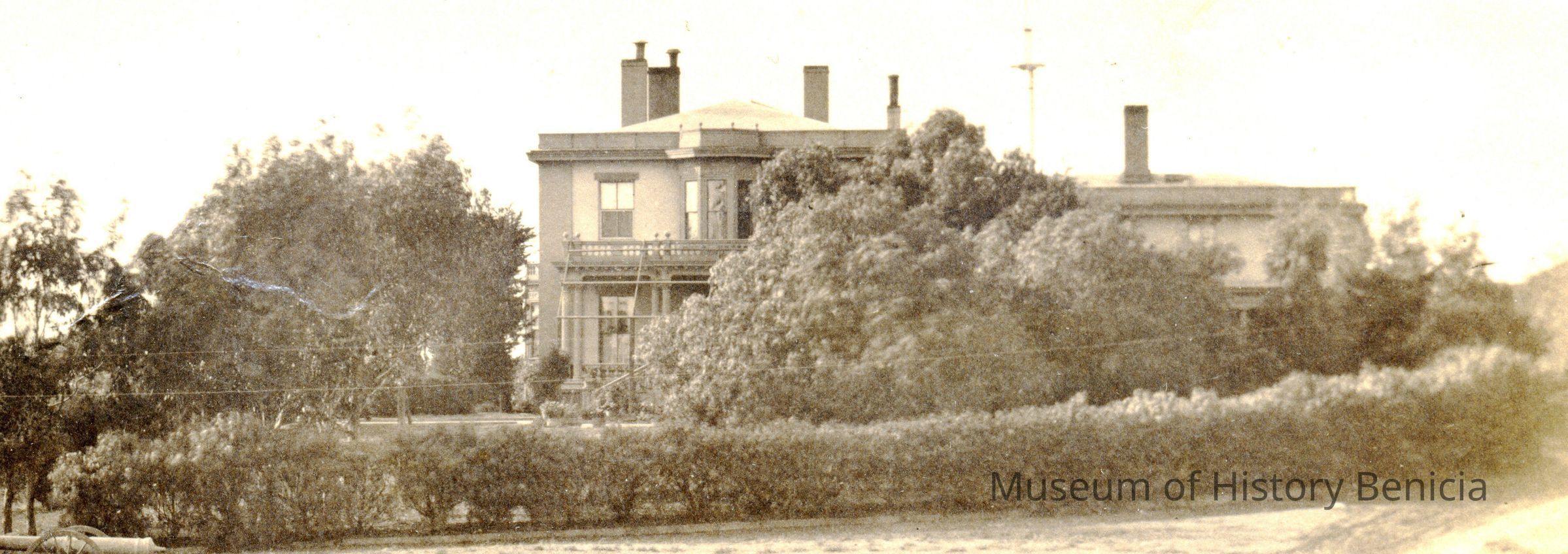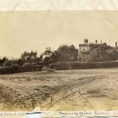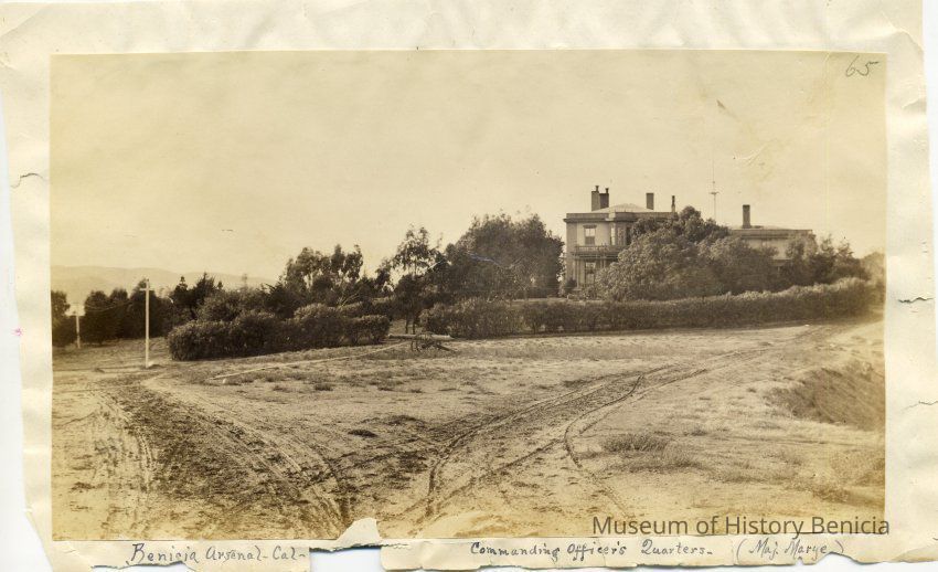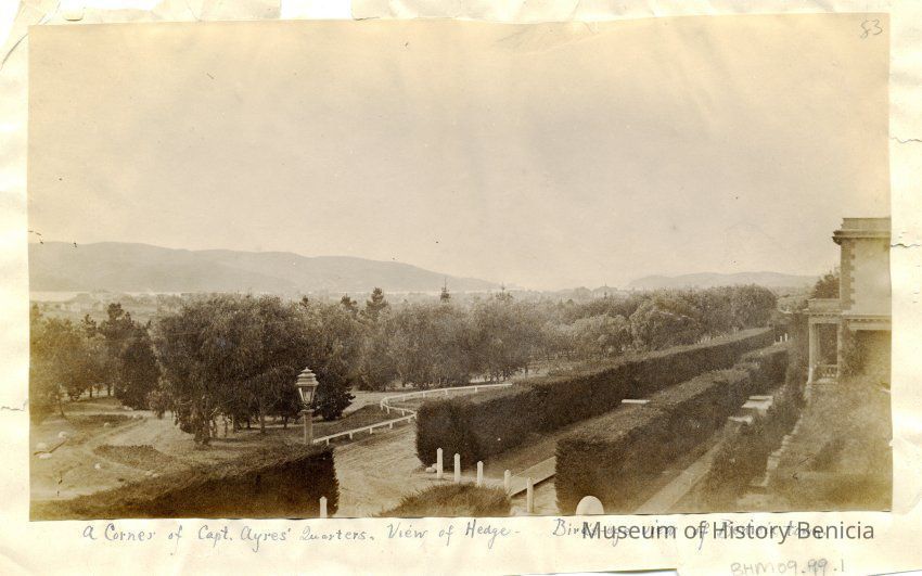 B - corner of Capt. Aryes's Quarters (Jefferson Mansion?) with view of officer's row lined by hedges. Benicia in the distance.Collection