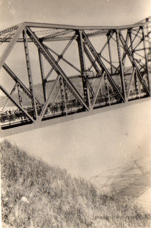 B/W photograph of the Dedication and Opening of the Carquinez Bridge showing people walking on the bridge; the view is from the Crockett side;