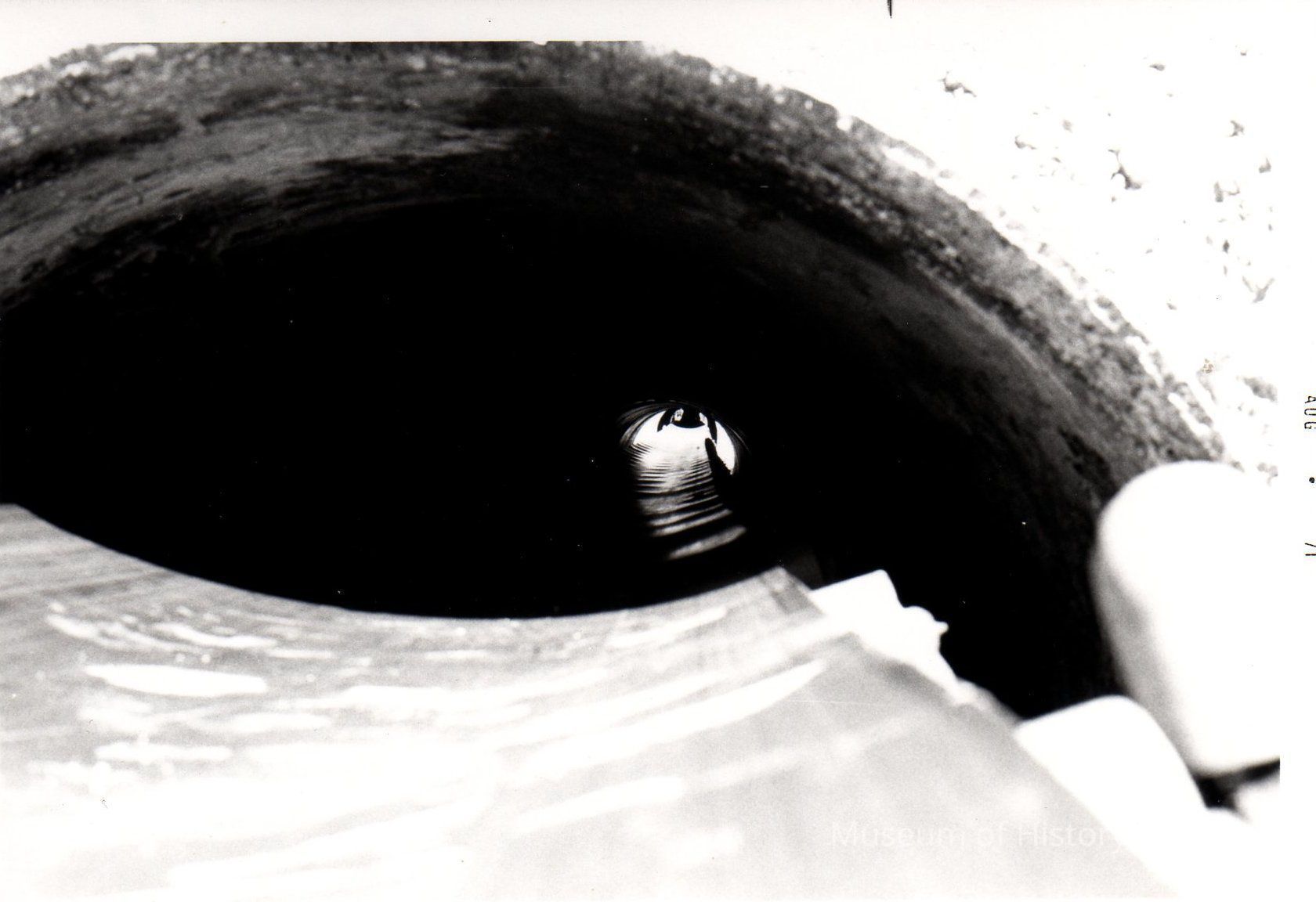 B/W Photograph: Industrial Park shore, east of Benicia Bridge; close-up look at conveyor belt tunnel going under the freeway.