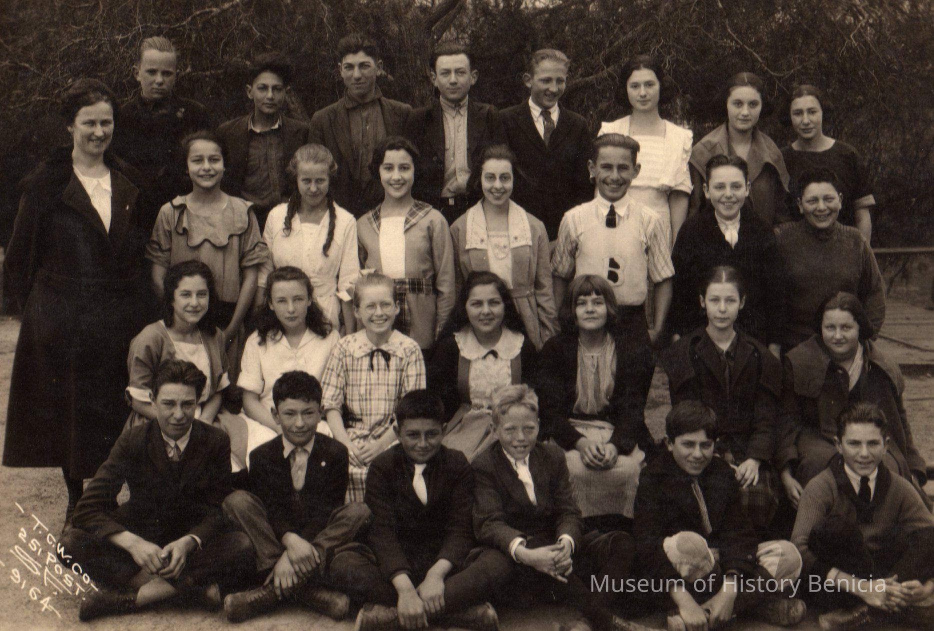 Black and white photo of fourteen boys, fourteen girls and one teacher posed outdoors. "TCW Co. / 251 Post / S.F. / 9164