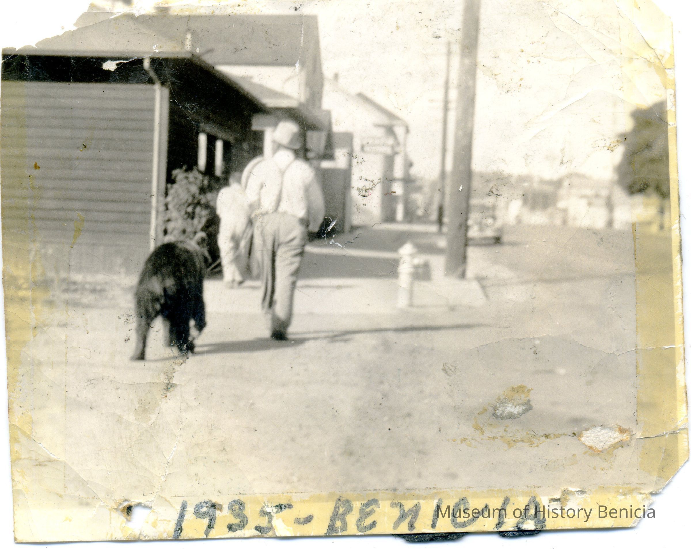 Photo of a man and a bear walking down the street in Benicia. Written on the bottom is "1935 - Benicia". This may be Mr. Charles M Curtis or his family. He owned the C.M. Curtis barbershop on First Street. According to his grandson, he lived just off First street on West "D" street. They owned two lots, one of which was used to house the pet bear.