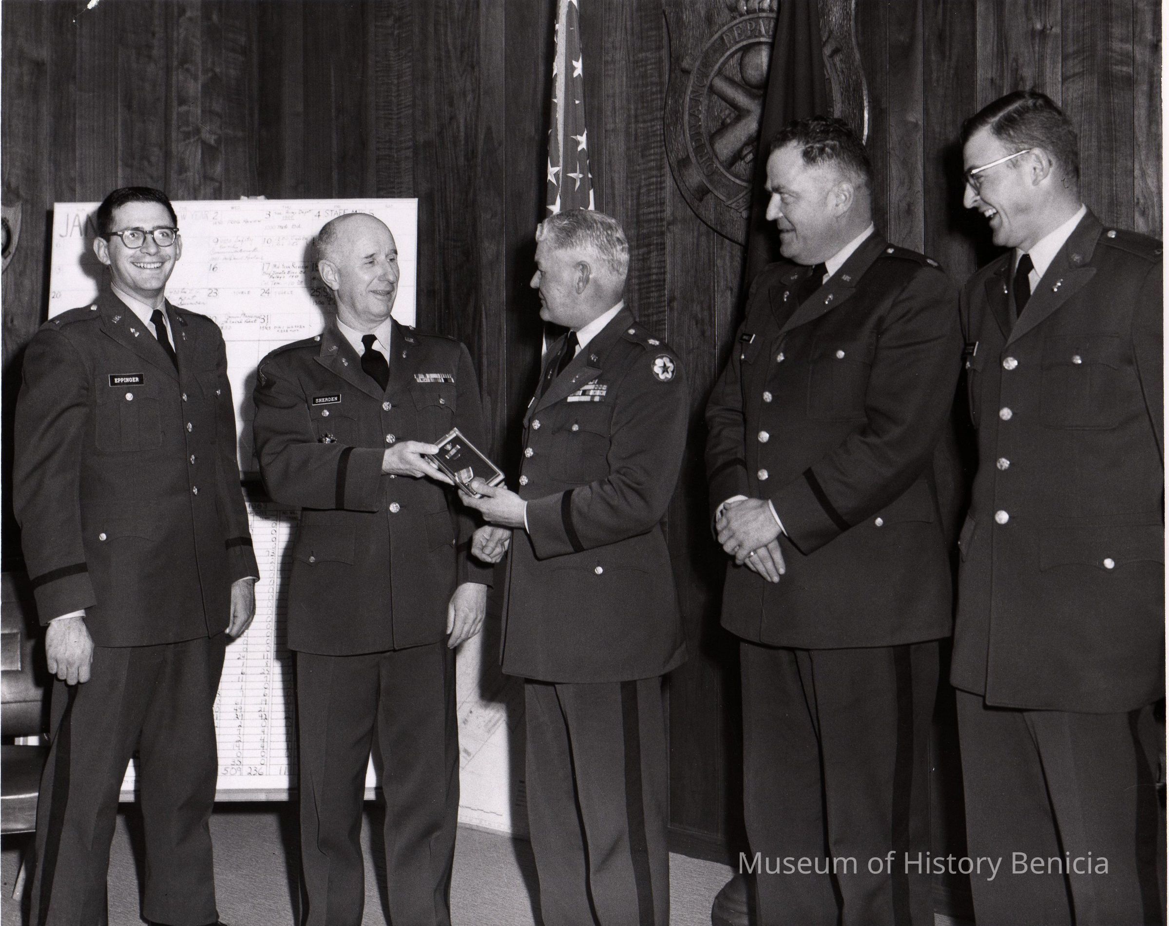 B/W photo of five men in dress uniform. "Lt. Ed. Eppinger, Col. John Sheriden (handing medal to) Maj. Warren, Maj. Shively, Lt. Ray Doucet" and "Peg Auger" in ink on back.Collection