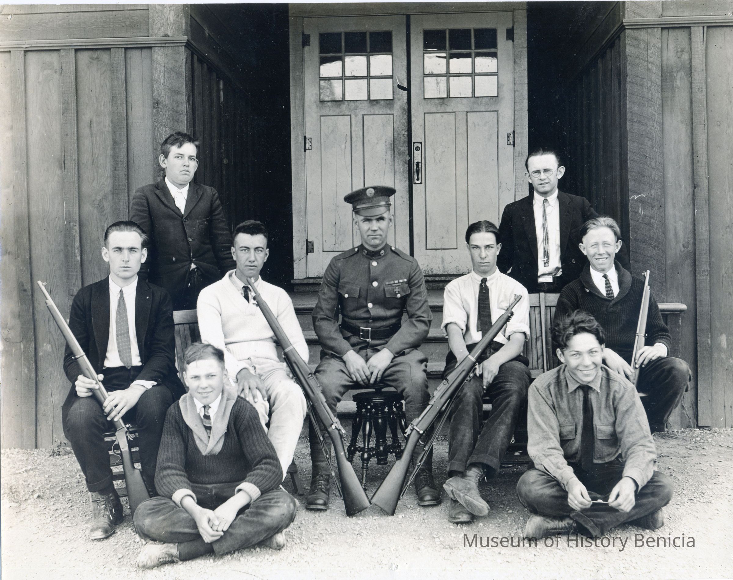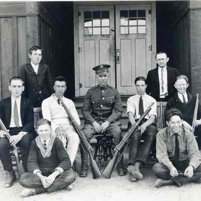 A uniformed man surrounded by eight men (young and old) posing with four rifles, two of which are held by two men on the outer right and left of the group.Collection