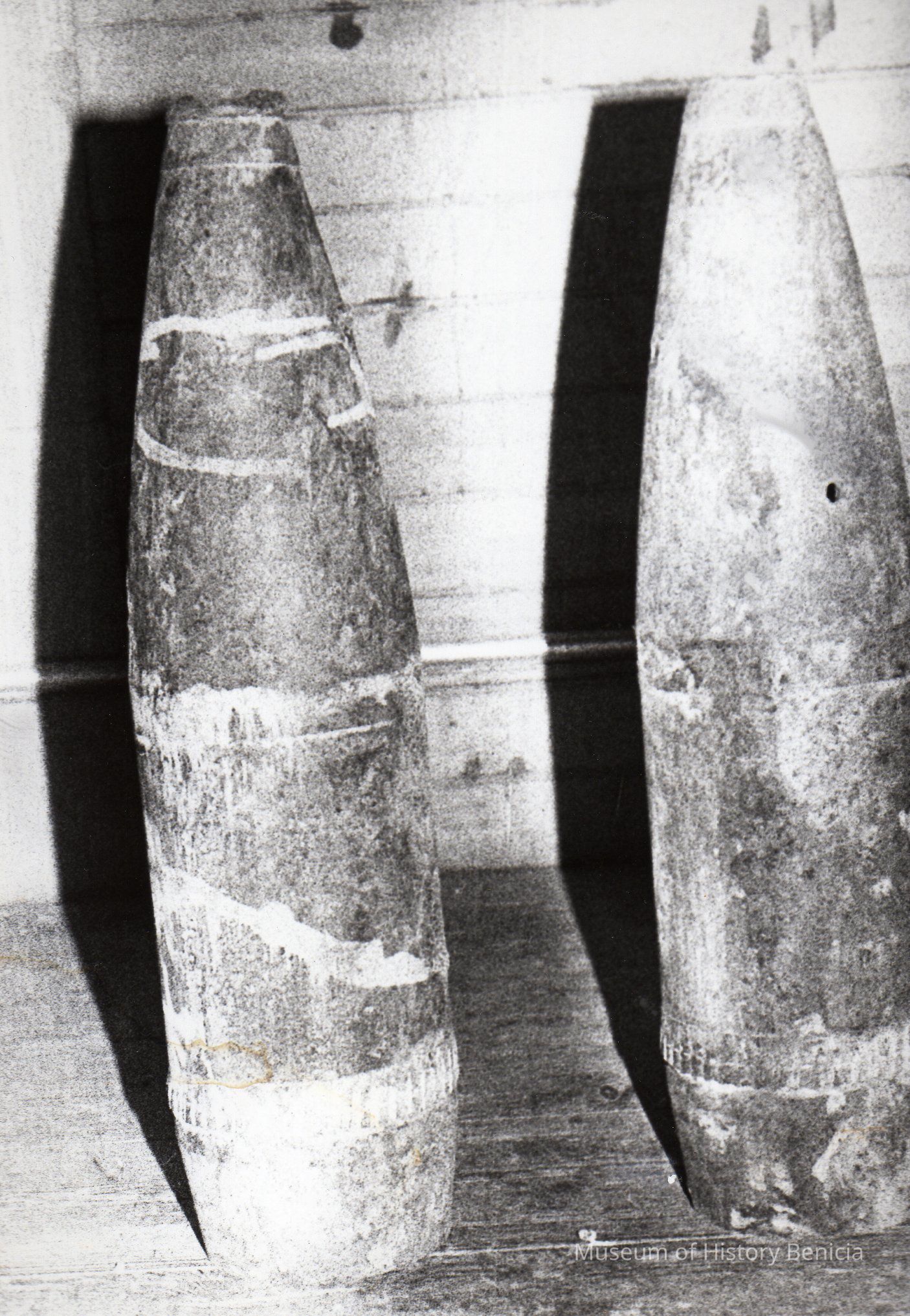 Two 155-mm test projectiles used in test firing of 155 barrels manufactured at Yuba Mfg. Co. in the 1950s. These were found in 1999 on the Tourtelot property. B/W photo.
