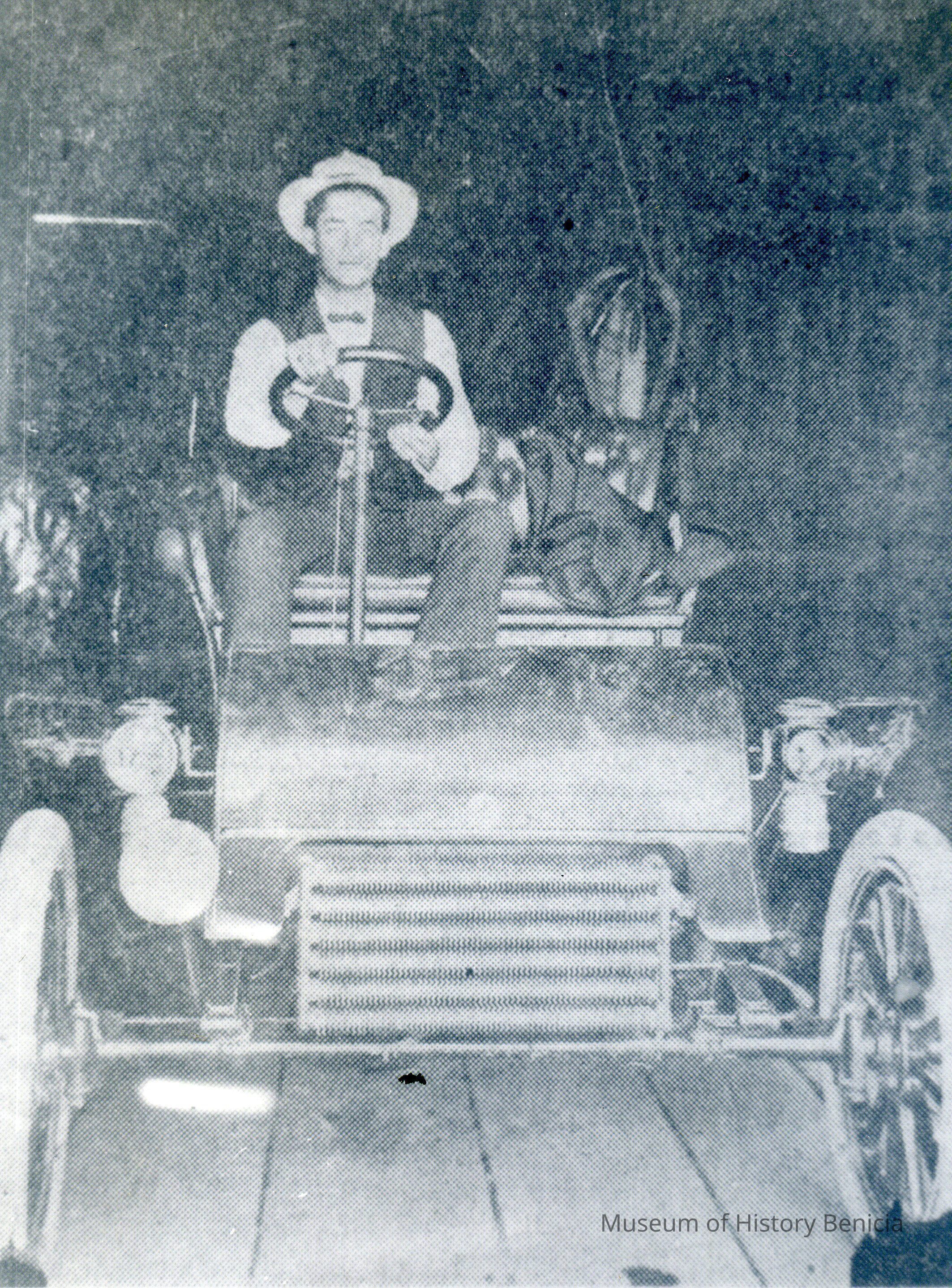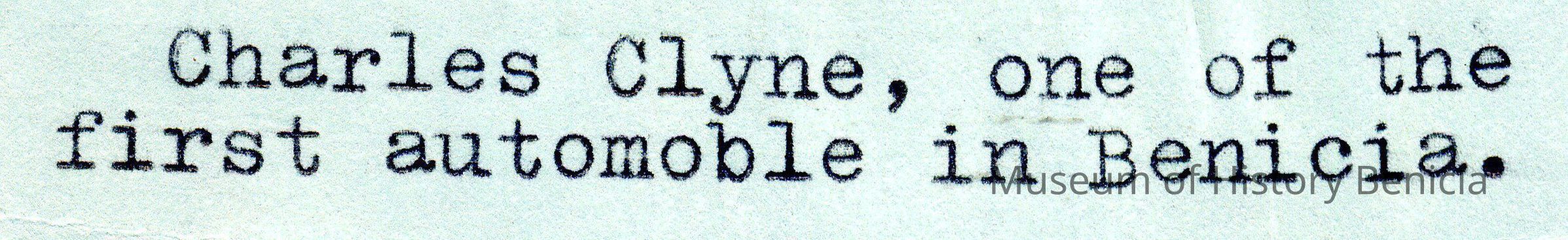 B/W photograph of Charles Clyne, on one of the first automobiles in Benicia. Written on the back is "Charles Clyne 1913 Ford".Collection