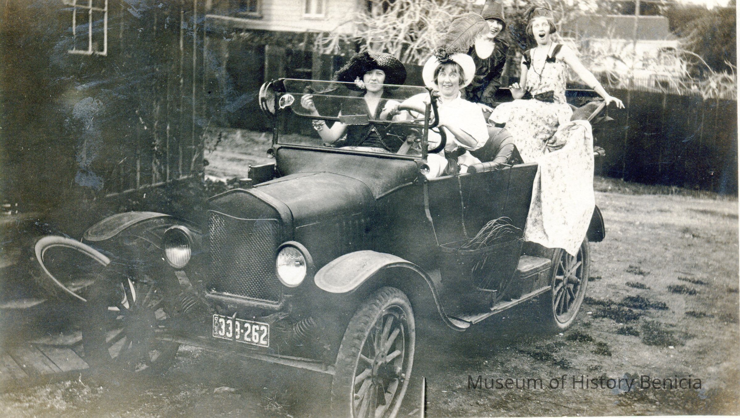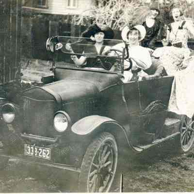 B/W photo of girls in auto at Halloween. The back says 1924.