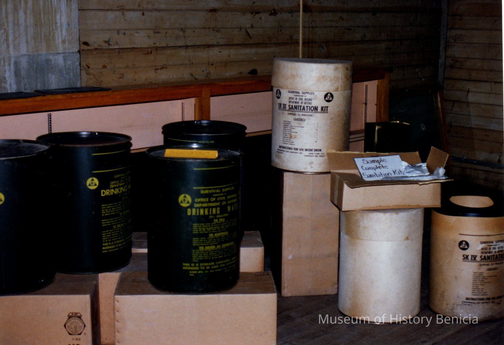 Color Photograph: Display in the Powder Magazine 10: Disaster kit for emergency use in case of atom bombs or other disasters. Issued by Office of Civil Defense, 1963. Left: drinking water cans; sanitation kit, center.Collection