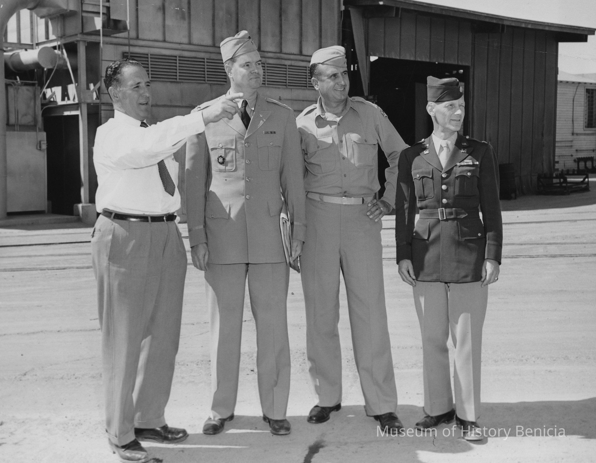 B/W Photograph: Col. W.P. McCrone checksout the construction at the Arsenal. L-R: Henry K. White, Col. McCrone, Maj. Frank L. Columbia, Maj. William O' Brien.