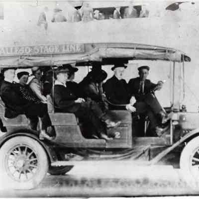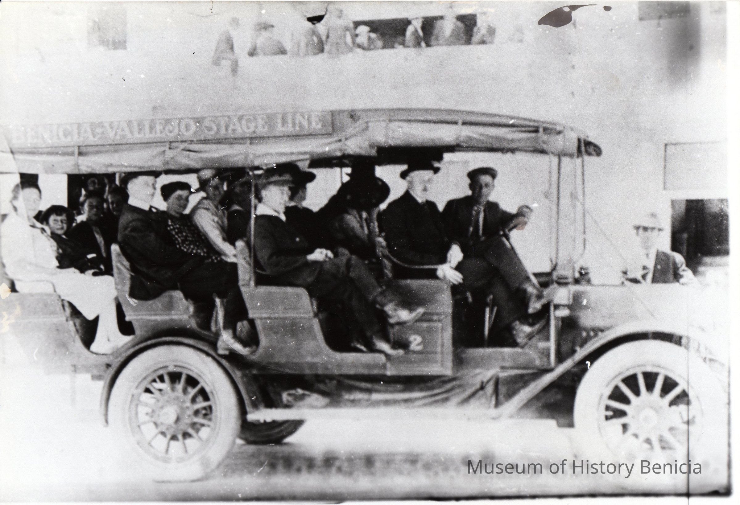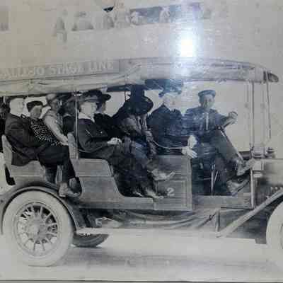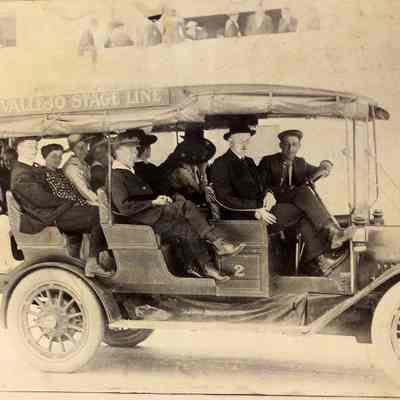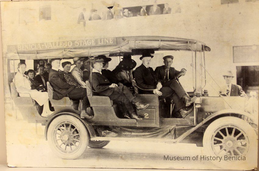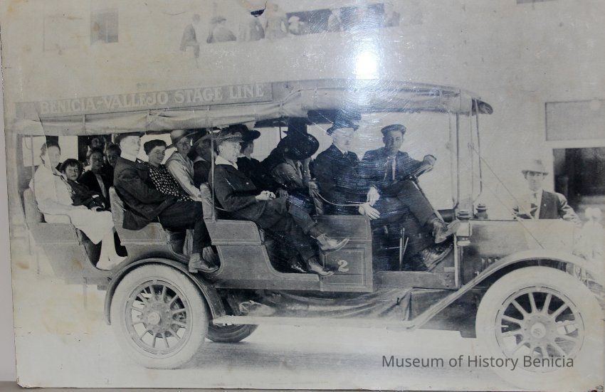 Photo of 1915 Buick of the Benicia-Vallejo Stage Line, which was owned and operated by the Passalacqua family. At the wheel is Milo Passalacqua, next to him is Kay Frame (Benician), sitting in the third row from the front wearing a white dress and wide brimmed hat is Flossie Kiley (Benician).Collection