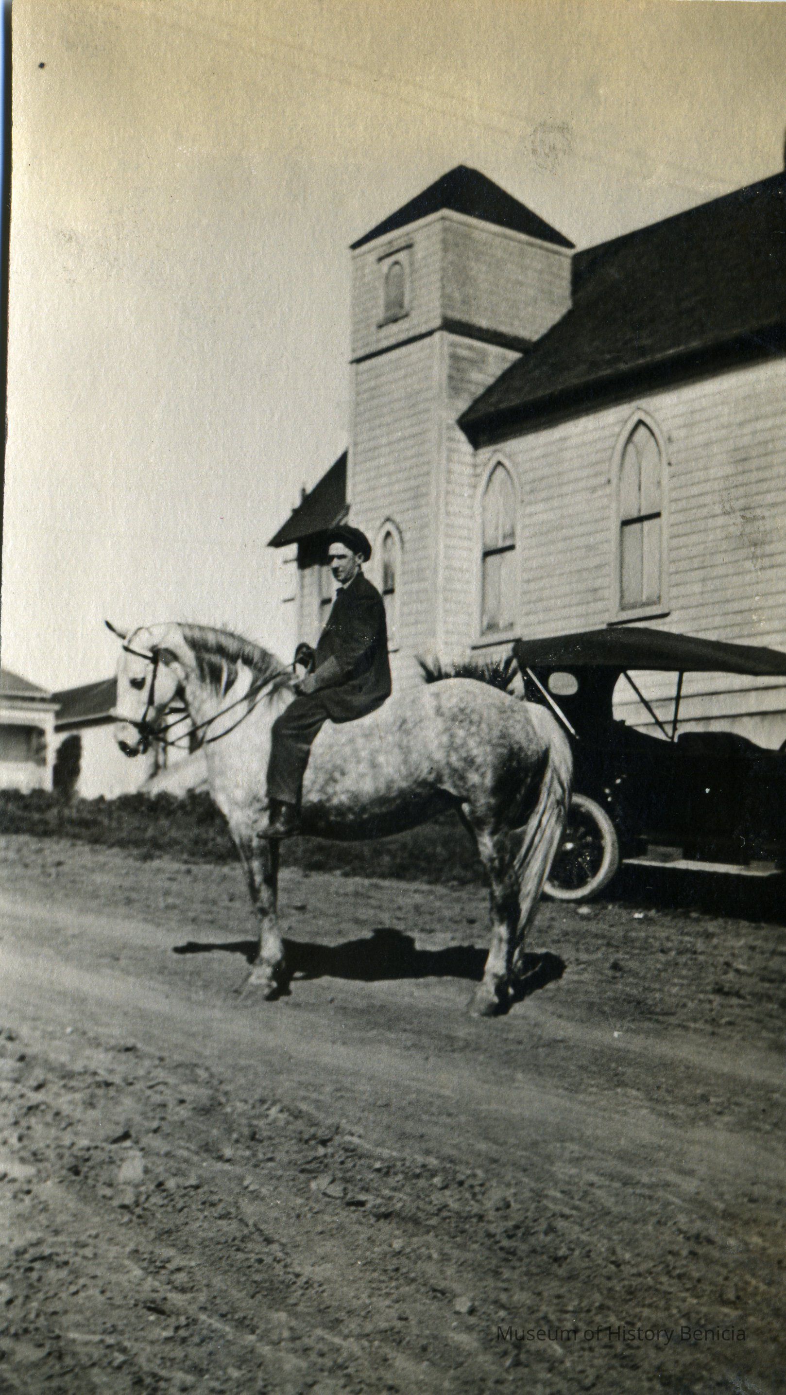 Vallie Ward, 1920's pageant. Man on horse, Methodist Church (now Dials Antiques) in background. Black and white photo.