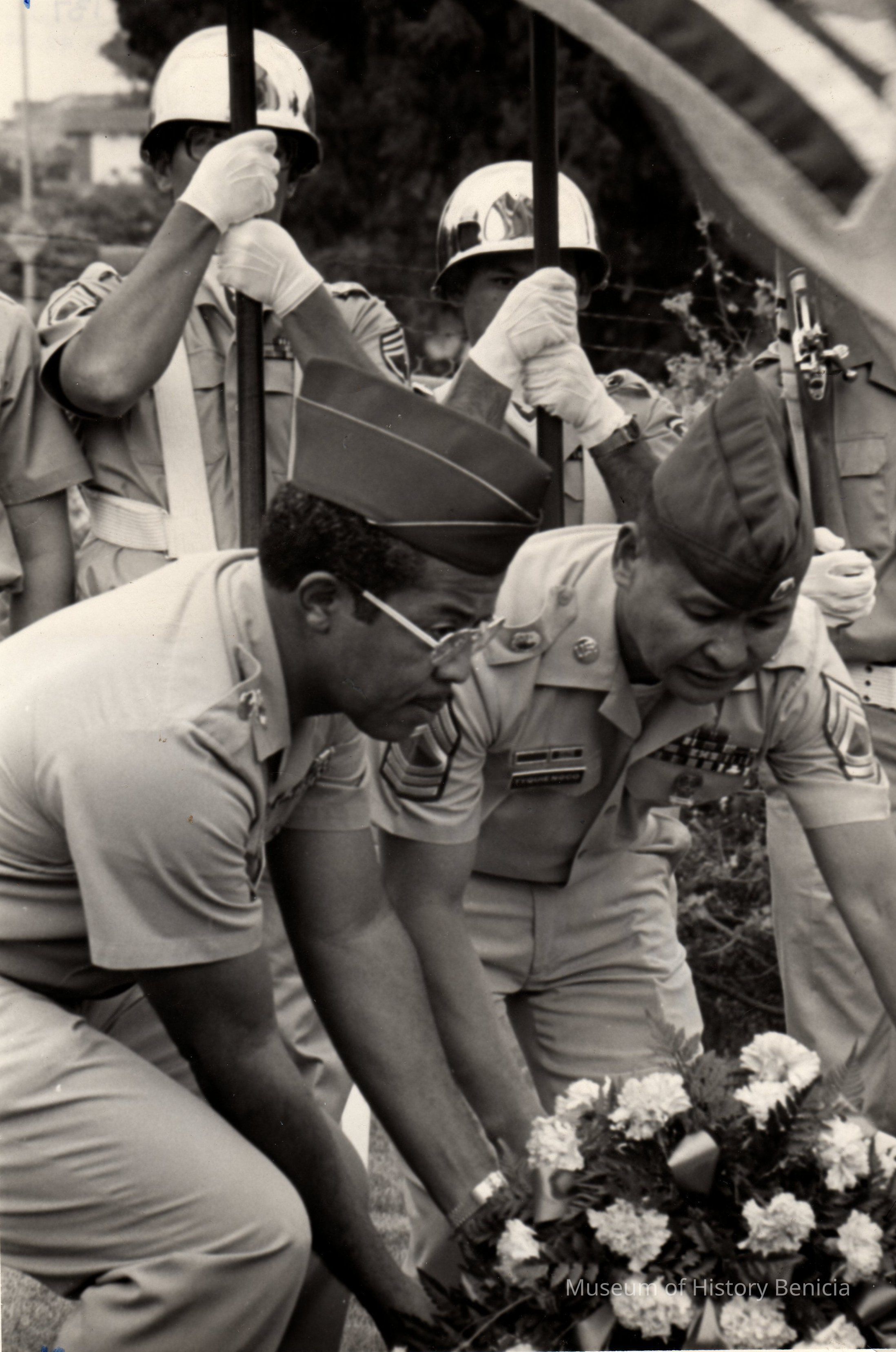 B/W photo of Benicia Military Cemetery, at Memorial Day services, 1982: flower placing by two men in uniform.