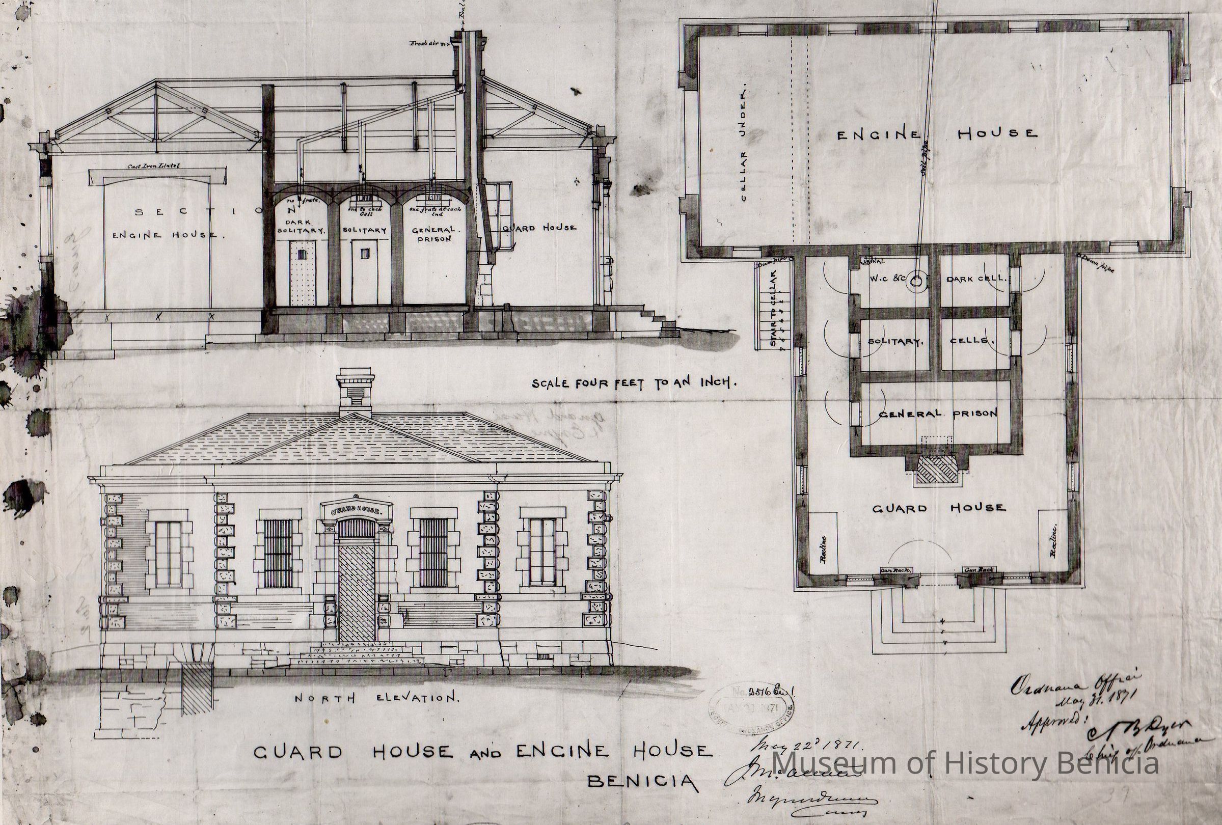 B/W copy from National Archives of floor plan, elevation and section of Guard House. Appears as Figure 124 in Bruegmann book. The Guard House, buildng 39, was built in 1872.Collection