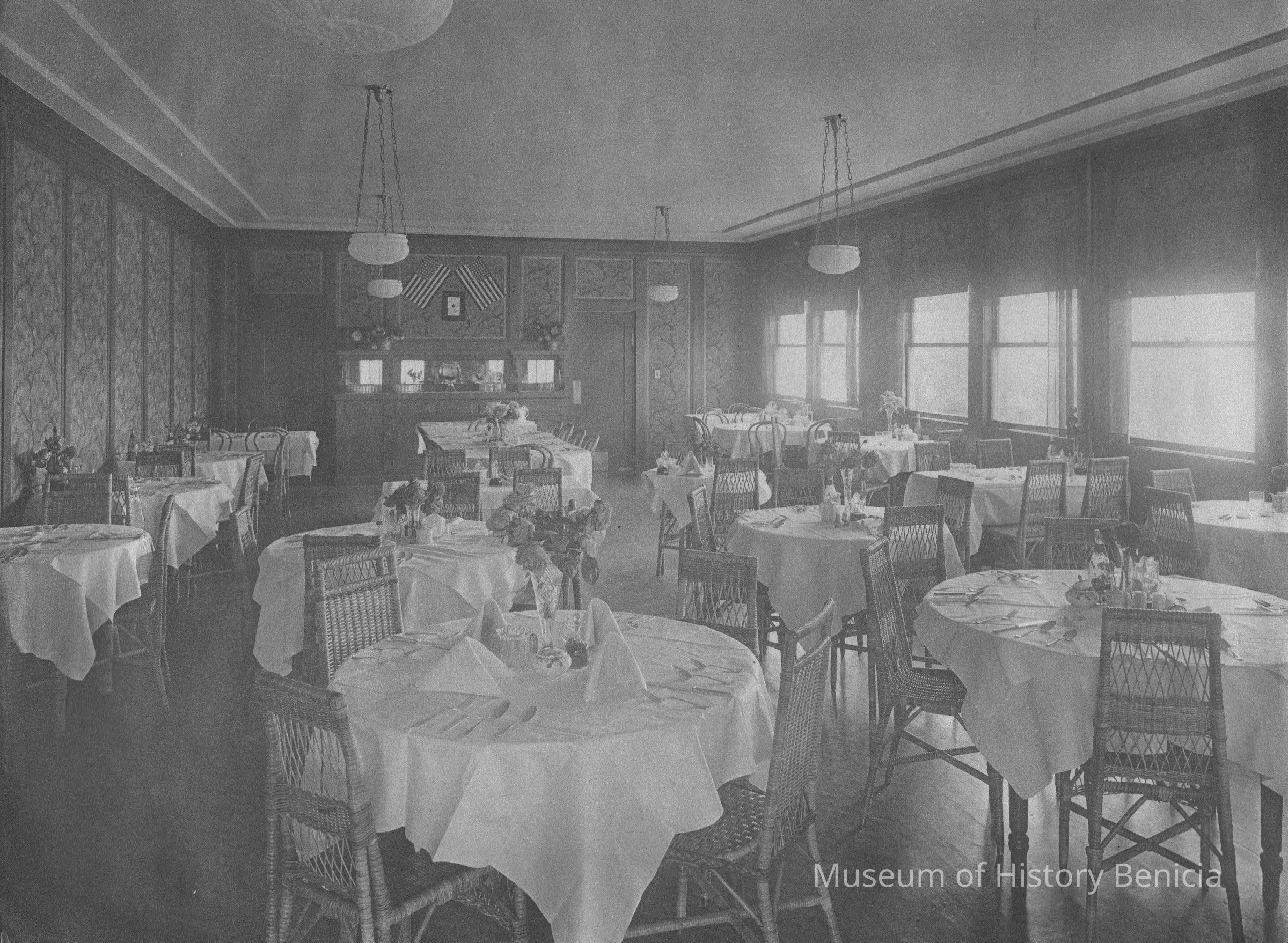 B/W photo of Anderson Hotel at end of F Street at water's edge. Anderson Hotel was originally the Ripson Hotel. This is a photo of the interior of the dining room.Collection