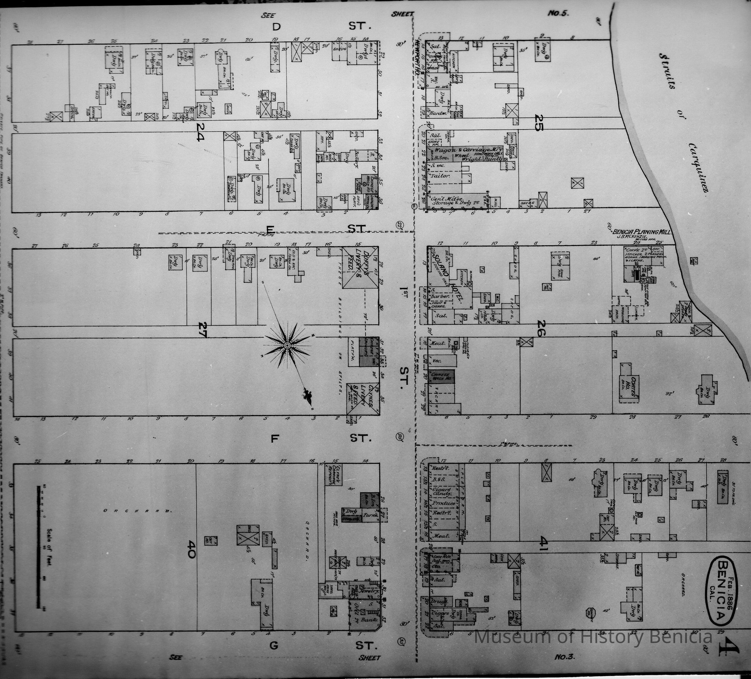 B/W photo of Sheet No. 4 of the 1886 Sanborn Insurance Co. map; this one shows First Street between D and G Streets.