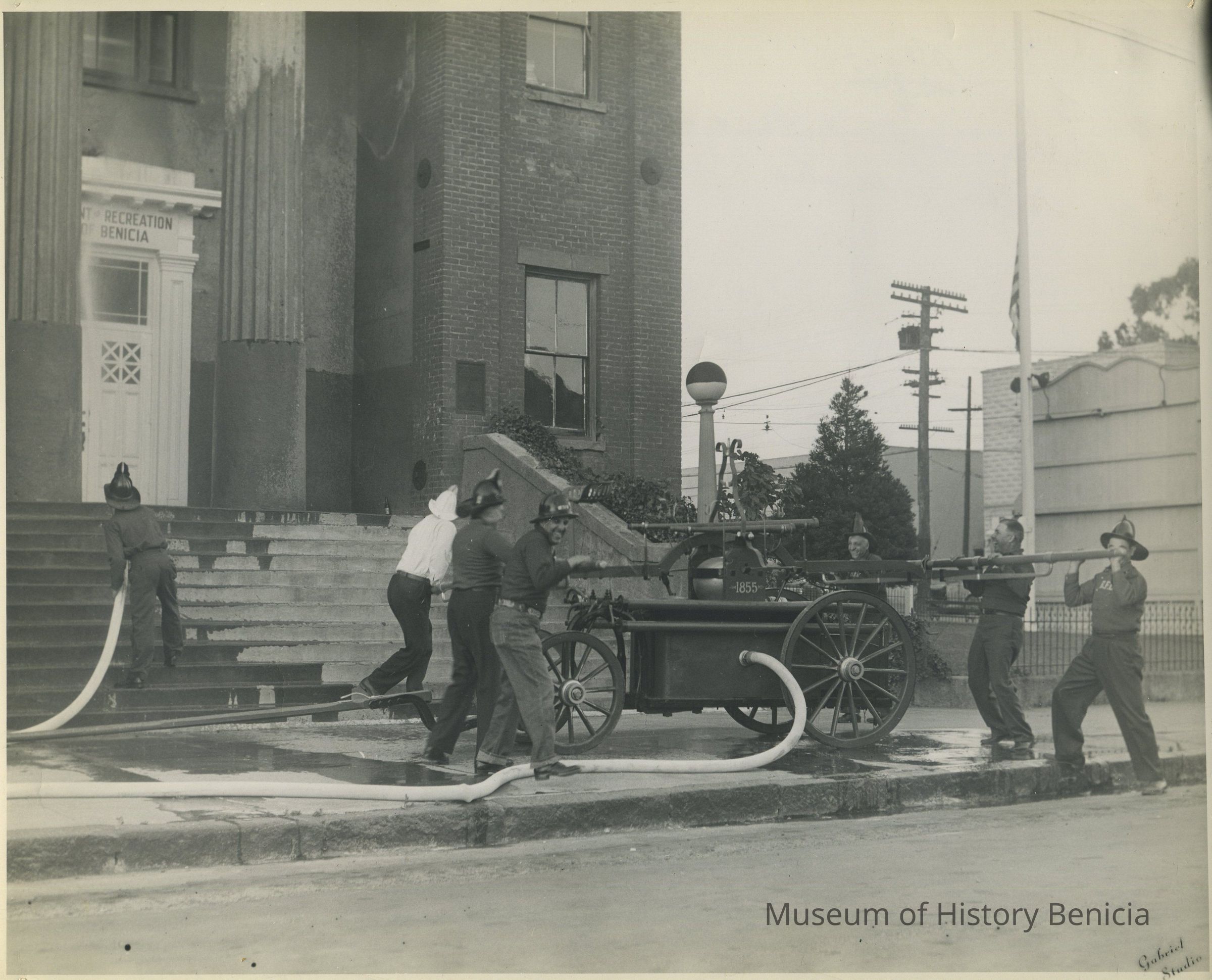 B/W photograph of firemen using an old pumper and washing the front of the old capitol building; at left front is Victor Fredricks, others unknown; at right: DeBenedetti, Precour, J. Gonsalves. "Gabriel Studio" is stamped in lower right corner.Collection