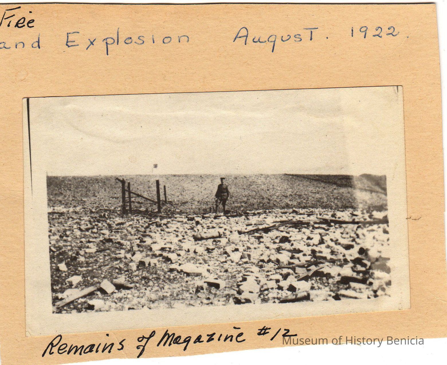 B/W photograph: Soldier standing amid rubble of Magazine 11, destroyed by explosion and fire of 1922.