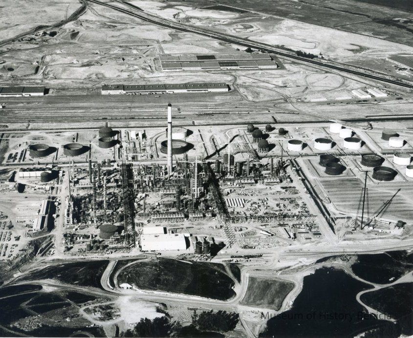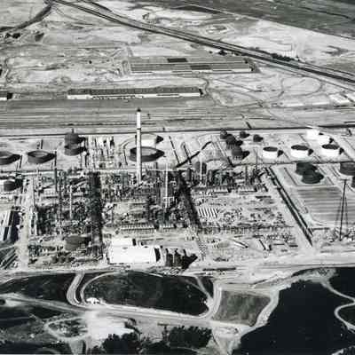 B/W aerial photo construction Humble Oil Refinery (later Exxon and Valero) looking north but focused downward on refining area; top to bottom: hiway 680, warehouses, railroad cars on sidings, storage tanks, refining equipment, tall smoke stack (in center), other towers, pipelines, support structures, storage buildings, cranes, piles of building materials, dark (burned?) empty ground, access roads.Collection
